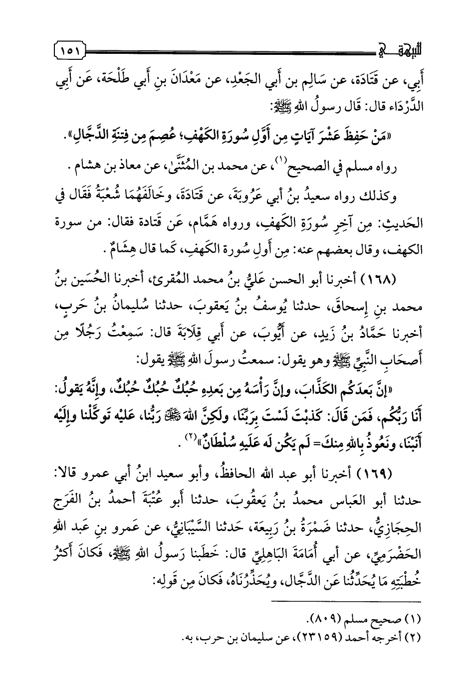 168 - أخبرنا أبو الحسن علي بن محمد المقرىء، أخبرنا الحسين بن محمد بن إسحاق، حدثنا يوسف بن يعقوب، حدثنا سليمان بن حرب، أخبرنا حماد بن زيد، عن أيوب، عن أبي قلابة قال: سمعت رجلا من أصحاب النبي صلى الله عليه وسلم وهو يقول: سمعت رسول الله صلى الله عليه وسلم يقول: "إن بعدكم الكذاب، وإن رأسه من بعده حبك حبك حبك، وإنه يقول: أنا ربكم، فمن قال: كذبت لست بربنا، ولكن الله عز وجل ربنا، عليه توكلنا وإليه أنبنا، ونعوذ بالله منك = لم يكن له عليه سلطان".