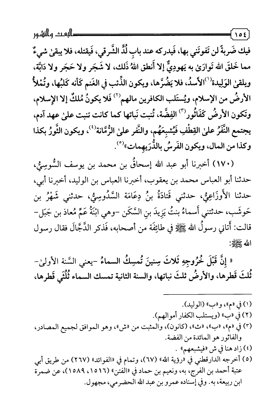170 - أخبرنا أبو عبد الله إسحاق بن محمد بن يوسف السوسي، حدثنا أبو العباس محمد بن يعقوب، أخبرنا العباس بن الوليد، أخبرنا أبي حدثنا الأوزاعي، حدثني قتادة بن دعامة السدوسي، حدثني شهر بن حوشب، حدثتني أسماء بنت يزيد بن السكن-وهي ابنة عم معاذ بن جبل- قالت: أتاني رسول الله صلى الله عليه وسلم في طائفة من أصحابه، فذكر الدجال فقال رسول الله صلى الله عليه وسلم: "إن قبل خروجه ثلاث سنين تمسك السماء -يعني السنة الأولى- ثلث قطرها، والأرض ثلث نباتها، والسنة الثانية تمسك السماء ثلثي قطرها، والأرض ثلثي نباتها، والسنة الثالثة تمسك السماء ما فيها، والأرض ما فيها، حتى يهلك كل ذي ضرس وظلف، وإن من أشد فتنته أن يقول للأعرابي: أرأيت إن أحييت لك إبلك عظيمة ضروعها، طويلة أسنمتها، تجتر، تعلم أني ربك؟ قال فيقول: نعم، قال فيتمثل له الشياطين، قال: ويقول للرجل: أرأيت إن أحييت لك أباك وأخاك وأمك، أتعلم أني ربك؟ قال فيقول: نعم، فيتمثل له الشياطين، قالت: ثم خرج رسول الله صلى الله عليه وسلم لحاجته، فوضعت له وضوءا، فانتحب القوم حتى ارتفعت أصواتهم، فأخذ رسول الله صلى الله عليه وسلم بلحي الباب فقال: مهيم؟ فقلت: يا رسول الله، خلعت قلوبهم بالدجال، فقال رسول الله صلى الله عليه وسلم: إن خرج وأنا فيكم، فأنا حجيجه، وإن مت فالله خليفتي على كل مؤمن، فقلت: يا رسول الله، وما يجزىء المؤمنين يومئذ؟ قال: يجزئهم ما يجزىء أهل السماء، التسبيح والتقديس".