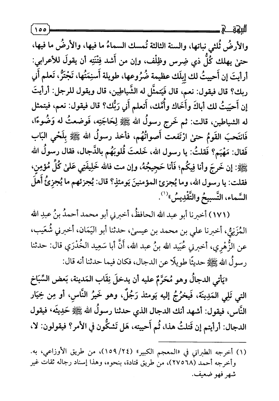 171 - أخبرنا أبو عبد الله الحافظ، أخبرني أبو محمد أحمد بن عبد الله المزني، أخبرنا علي بن محمد بن عيسى، حدثنا أبو اليمان، أخبرني شعيب، عن الزهري، أخبرني عبيد الله بن عبد الله، أن أبا سعيد الخدري قال: حدثنا رسول الله صلى الله عليه وسلم حديثا طويلا عن الدجال، فكان فيما حدثنا أنه قال: "يأتي الدجال وهو محرم عليه أن يدخل نقاب المدينة، بعض السباخ التي تلي المدينة، فيخرج إليه يومئذ رجل، وهو خير الناس، أو من خيار الناس، فيقول: أشهد أنك الدجال الذي حدثنا رسول الله صلى الله عليه وسلم حديثه، فيقول الدجال: أرأيتم إن قتلت هذا، ثم أحييته، هل تشكون في الأمر؟ فيقولون: لا، فيقتله، ثم يحييه، فيقول حين يحييه: والله ما كنت فيك أشد بصيرة قط مني اليوم، قال فيريد الدجال أن يقتله، فلا يسلط عليه". رواه البخاري في الصحيح، عن أبي اليمان، ورواه مسلم، عن عبد الله بن عبد الرحمن الدارمي، عن أبي اليمان.
