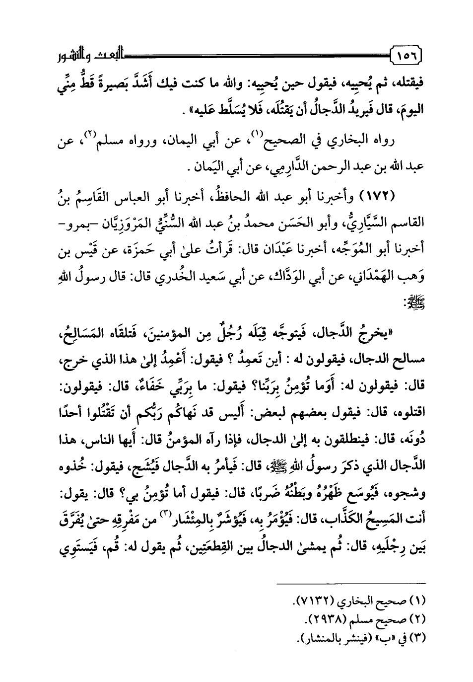 172 - وأخبرنا أبو عبد الله الحافظ، أخبرنا أبو العباس القاسم بن القاسم السياري، وأبو الحسن محمد بن عبد الله السني المروزيان -بمرو- أخبرنا أبو الموجه، أخبرنا عبدان قال: قرأت على أبي حمزة، عن قيس بن وهب الهمداني، عن أبي الوداك، عن أبي سعيد الخدري قال: قال رسول الله صلى الله عليه وسلم: "يخرج الدجال فيتوجه قبله رجل من المؤمنين، فتلقاه المسالح مسالح الدجال، فيقولون له: أين تعمد؟ فيقول: أعمد إلى هذا الذي خرج، قال: فيقولون له: أوما تؤمن بربنا؟ فيقول: ما بربي خفاء، قال: فيقولون: اقتلوه، قال: فيقول بعضهم لبعض: أليس قد نهاكم ربكم أن تقتلوا أحدا دونه، قال: فينطلقون به إلى الدجال، فإذا رآه المؤمن قال: أيها الناس، هذا الدجال الذي ذكر رسول الله صلى الله عليه وسلم قال: فيأمر به الدجال فيشج، فيقول: خذوه وشجوه، فيوسع ظهره وبطنه ضربا، قال: فيقول أما تؤمن بي؟ قال: يقول: أنت المسيح الكذاب، قال: فيؤمر به، فيؤشر بالمئشار من مفرقه حتى يفرق بين رجليه، قال: ثم يمشى الدجال بين القطعتين، ثم يقول له: قم، فيستوي قائما، قال: فيقول له: أما تؤمن بي؟ قال: فيقول: ما ازددت فيك إلا بصيرة، قال: ثم يقول: يا أيها الناس، إنه لا يفعل ما فعل بي بأحد من الناس، قال: فيأخذه الدجال ليذبحه، قال: فيجعل ما بين رقبته إلى ترقوته نحاسا، فلا يستطيع إليه سبيلا، قال: فيأخذ بيديه، ورجليه فيقذف به، يحسب الناس أنما قذفه إلى النار، وإنما ألقي في الجنة، فقال رسول الله صلى الله عليه وسلم: هذا أعظم الناس شهادة عند رب العالمين".