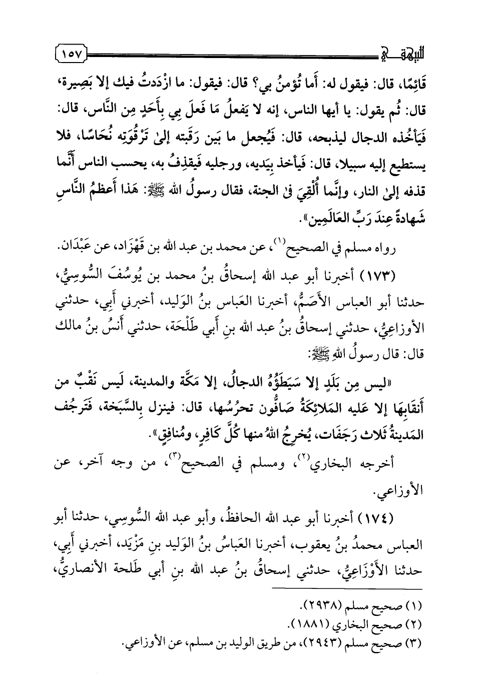 174 - أخبرنا أبو عبد الله الحافظ، وأبو عبد الله السوسي، حدثنا أبو العباس محمد بن يعقوب، أخبرنا العباس بن الوليد بن مزيد، أخبرني أبي، حدثنا الأوزاعي، حدثني إسحاق بن عبد الله بن أبي طلحة الأنصاري، حدثني أنس قال: قال رسول الله صلى الله عليه وسلم: "يتبع الدجال سبعون ألفا من يهود أصبهان، عليهم الطيالسة". أخرجه مسلم في الصحيح، من وجه أخر، عن الأوزاعي.