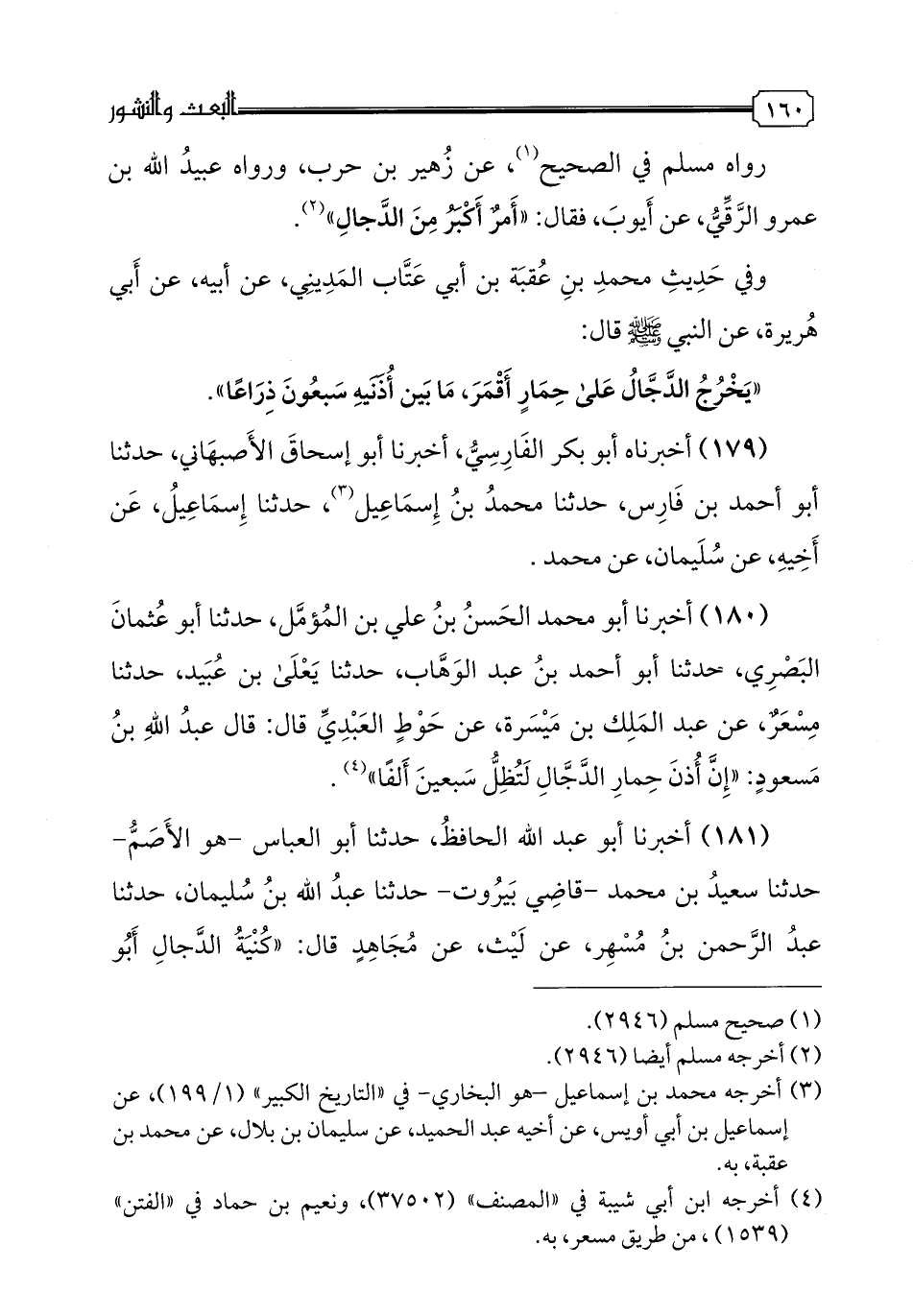 180 - أخبرنا أبو محمد الحسن بن علي بن المؤمل، حدثنا أبو عثمان البصري، حدثنا أبو أحمد بن عبد الوهاب، حدثنا يعلى بن عبيد، حدثنا مسعر، عن عبد الملك بن ميسرة، عن حوط العبدي قال: قال عبد الله بن مسعود: "إن أذن حمار الدجال لتظل سبعين ألفا".