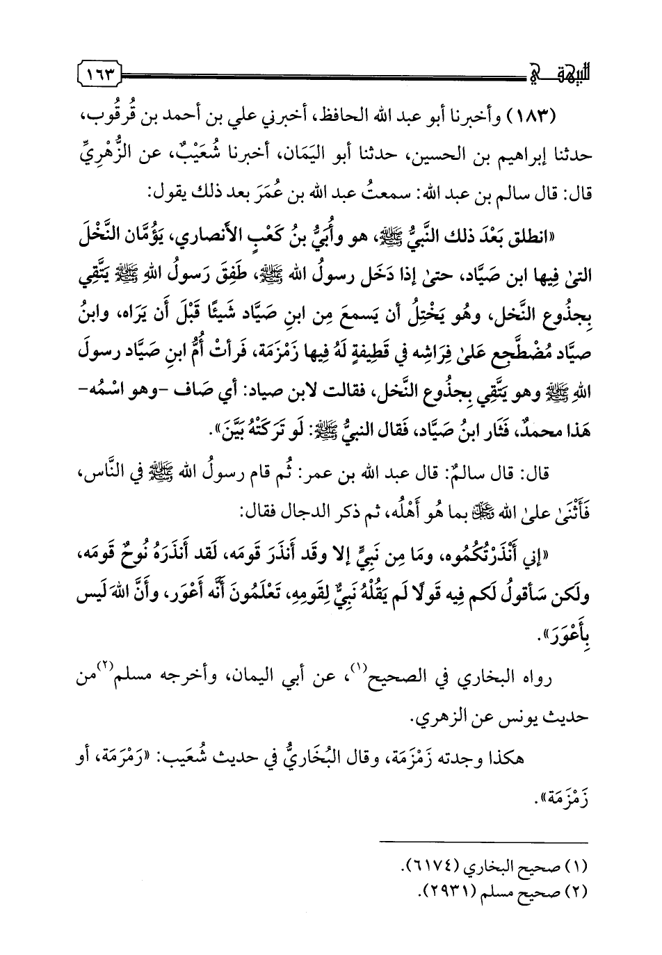 183 - وأخبرنا أبو عبد الله الحافظ، أخبرني علي بن أحمد بن قرقوب، حدثنا إبراهيم بن الحسين، حدثنا أبو اليمان، أخبرنا شعيب، عن الزهري قال: قال سالم بن عبد الله: سمعت عبد الله بن عمر بعد ذلك يقول: "انطلق بعد ذلك النبي صلى الله عليه وسلم، هو وأبي بن كعب الأنصاري، يؤمان النخل التي فيها ابن صياد، حتى إذا دخل رسول الله صلى الله عليه وسلم، طفق رسول الله صلى الله عليه وسلم يتقي بجذوع النخل، وهو يختل أن يسمع من ابن صياد شيئا قبل أن يراه، وابن صياد مضطجع على فراشه في قطيفة له فيها زمزمة، فرأت أم ابن صياد رسول الله صلى الله عليه وسلم وهو يتقي بجذوع النخل، فقالت لابن صياد: أي صاف -هو اسمه هذا محمد، فثار ابن صياد، فقال النبي صلى الله عليه وسلم: لو تركته بين".