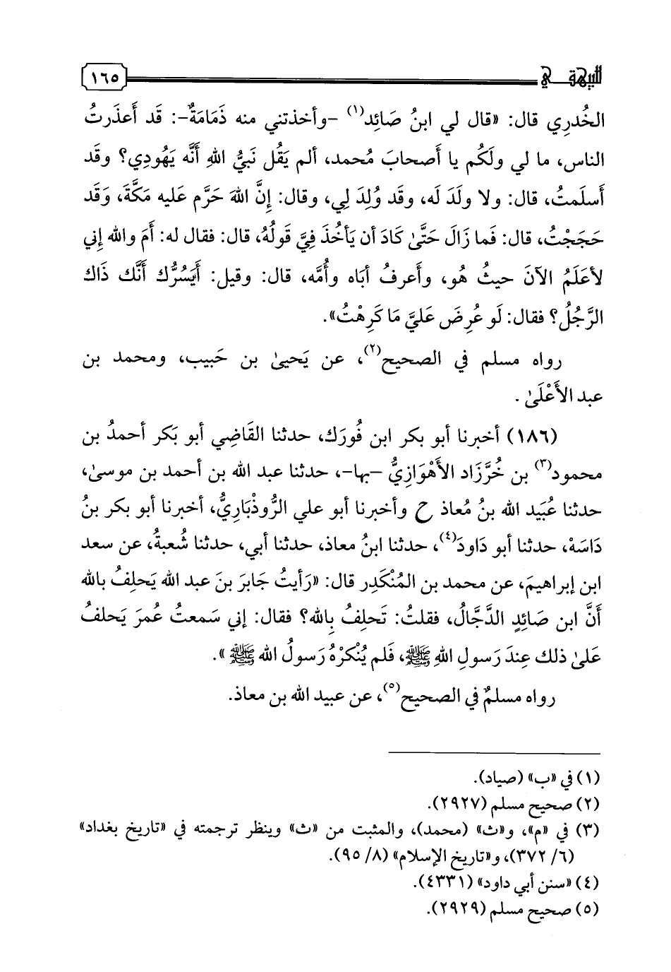 186 - أخبرنا أبو بكر بن فورك، حدثنا القاضي أبو بكر أحمد بن محمود بن خرزاد الأهوازي -بها-، حدثنا عبد الله بن أحمد بن موسى، حدثنا عبيد الله بن معاذ ح وأخبرنا أبو علي الروذباري، أخبرنا أبو بكر بن داسه، حدثنا أبو داود، حدثنا ابن معاذ، حدثنا أبي، حدثنا شعبة، عن سعد بن إبراهيم، عن محمد بن المنكدر قال: "رأيت جابر بن عبد الله يحلف بالله أن ابن صائد الدجال، فقلت: تحلف بالله؟ فقال: إني سمعت عمر يحلف على ذلك عند رسول الله صلى الله عليه وسلم، فلم ينكره رسول الله صلى الله عليه وسلم". رواه مسلم في الصحيح، عن عبيد الله بن معاذ.