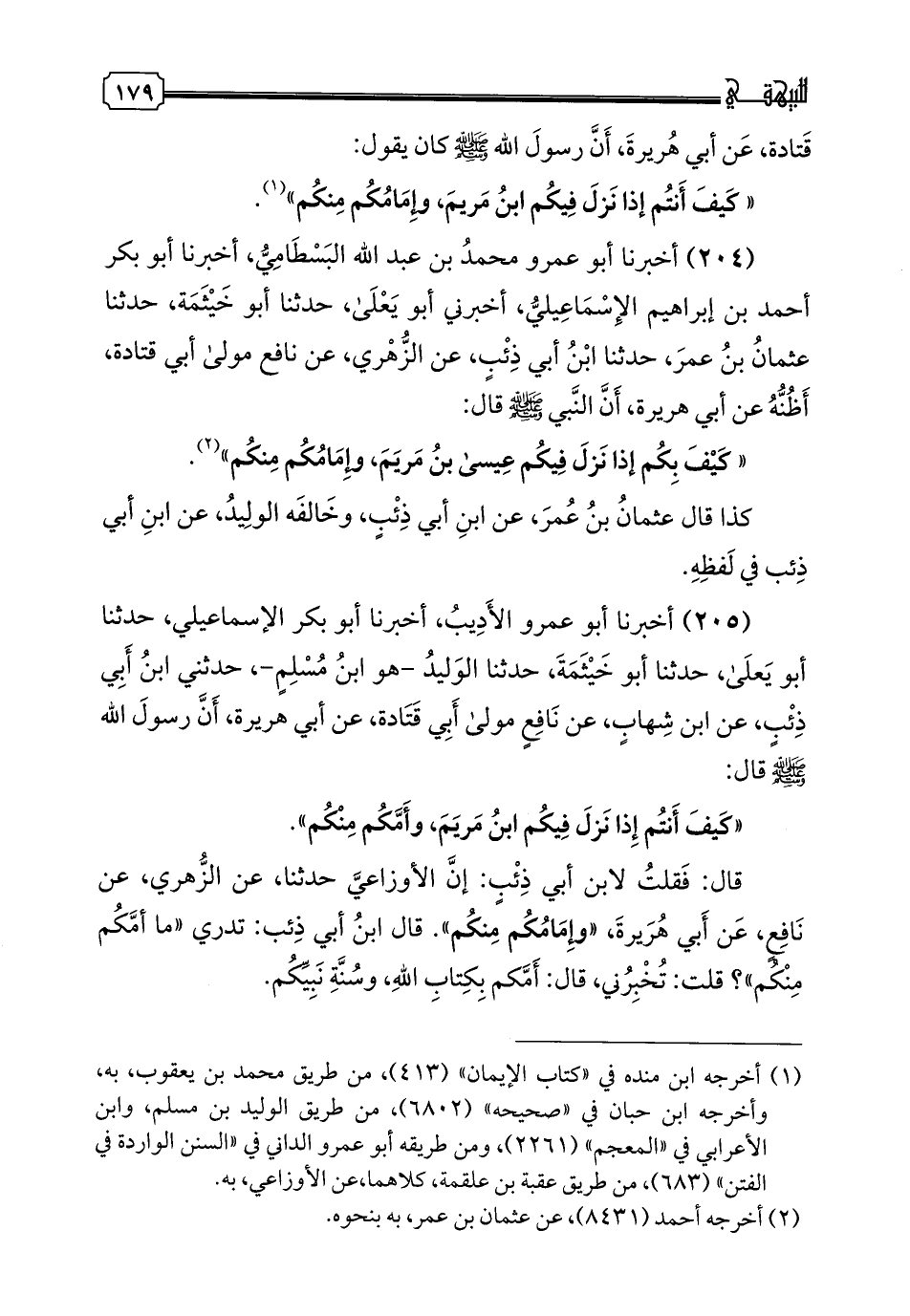 204 - أخبرنا أبو عمرو محمد بن عبد الله البسطامي، أخبرنا أبو بكر أحمد بن إبراهيم الإسماعيلي، أخبرني أبو يعلى، حدثنا أبو خيثمة، حدثنا عثمان بن عمر، حدثنا ابن أبي ذئب، عن الزهري، عن نافع مولى أبي قتادة، أظنه عن أبي هريرة، أن النبي صلى الله عليه وسلم قال: "كيف بكم إذا نزل فيكم عيسى بن مريم، وإمامكم منكم". كذا قال عثمان بن عمر، عن ابن أبي ذئب، وخالفه الوليد، عن ابن أبي ذئب في لفظه.
