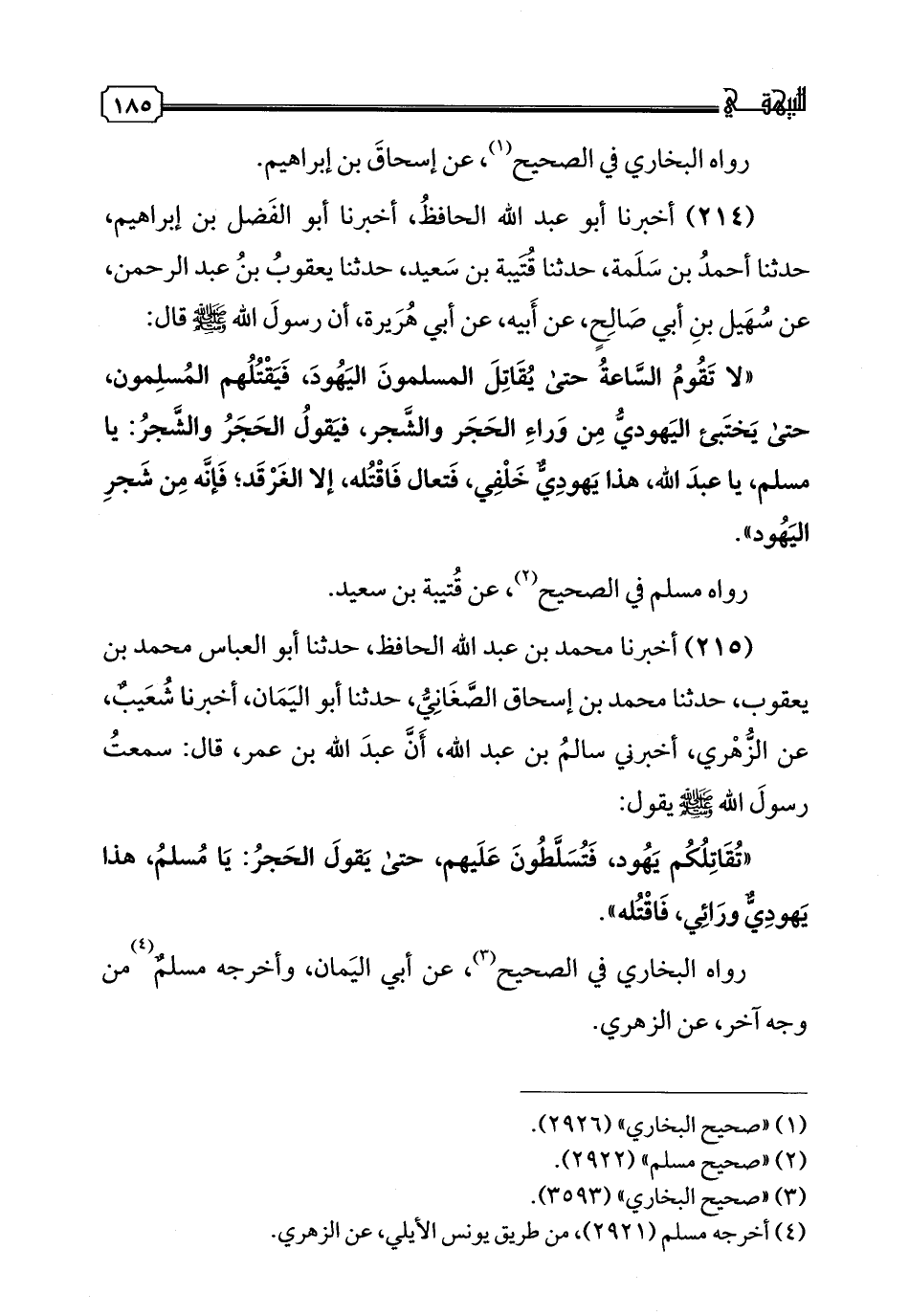 215 - أخبرنا محمد بن عبد الله الحافظ، حدثنا أبو العباس محمد بن يعقوب، حدثنا محمد بن إسحاق الصغاني، حدثنا أبو اليمان، أخبرنا شعيب، عن الزهري، أخبرني سالم بن عبد الله، أن عبد الله بن عمر، قال: سمعت رسول الله صلى الله عليه وسلم يقول: "تقاتلكم يهود، فتسلطون عليهم، حتى يقول الحجر: يا مسلم، هذا يهودي ورائي، فاقتله". رواه البخاري في الصحيح، عن أبي اليمان، وأخرجه مسلم من وجه آخر، عن الزهري.