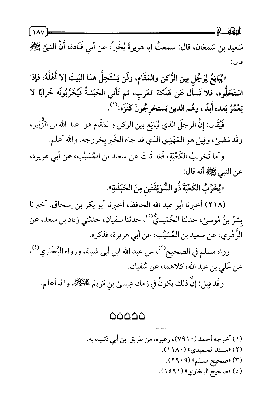 218 - أخبرنا أبو عبد الله الحافظ، أخبرنا أبو بكر بن إسحاق، أخبرنا بشر بن موسى، حدثنا الحميدي، حدثنا سفيان، حدثني زياد بن سعد، عن الزهري، عن سعيد بن المسيب، عن أبي هريرة، فذكره. رواه مسلم في الصحيح، عن عبد الله بن أبي شيبة، ورواه البخاري، عن علي بن عبد الله، كلاهما، عن سفيان.