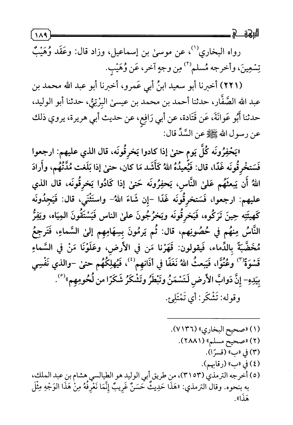 221 - أخبرنا أبو سعيد ابن أبي عمرو، أخبرنا أبو عبد الله محمد بن عبد الله الصفار، حدثنا أحمد بن محمد بن عيسى البرتي، حدثنا أبو الوليد حدثنا أبو عوانة، عن قتادة، عن أبي رافع، عن حديث أبي هريرة، يروي ذلك عن رسول الله صلى الله عليه وسلم عن السد قال: "يحفرونه كل يوم حتى إذا كادوا يخرقونه، قال الذي عليهم: ارجعوا فستخرقونه غدا، قال: فيعيده الله كأشد ما كان، حتى إذا بلغت مدتهم، وأراد الله أن يبعثهم على الناس، يحفرونه حتى إذا كادوا يخرقونه، قال الذي عليهم: ارجعوا، فستخرقونه غدا-إن شاء الله-واستثنى، قال: فيجدونه كهيئتة حين تركوه، فيخرقونه ويخرجون على الناس فيستقون المياه، ويفر الناس منهم في حصونهم، قال: ثم يرمون بسهامهم إلى السماء، فترجع مخضبة بالدماء، فيقولون: قهرنا من في الأرض، وعلونا من في السماء قسوة وعتوا، فيبعث الله نغفا في أذانهم، فيهلكهم حتى -والذي نفسي بيده- إن دواب الأرض لتسمن وتبطر وتشكر شكرا من لحومهم". وقوله: تشكر: أي تمتلىء.