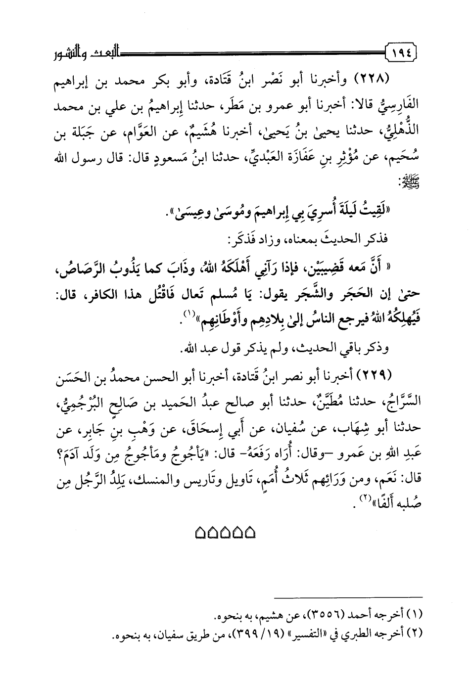 228 - وأخبرنا أبو نصر ابن قتادة، وأبو بكر محمد بن إبراهيم الفارسي قالا: أخبرنا أبو عمرو بن مطر، حدثنا إبراهيم بن علي بن محمد الذهلي، حدثنا يحيى بن يحيى، أخبرنا هشيم، عن العوام، عن جبلة بن سحيم، عن مؤثر بن عفازة العبدي، حدثنا ابن مسعود قال: قال رسول الله صلى الله عليه وسلم: "لقيت ليلة أسري بي إبراهيم وموسى وعيسى".