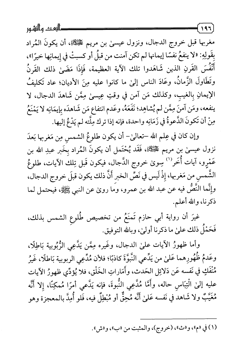 وروينا في حديث غيره عن النبي صلى الله عليه وسلم، ما يدل على أن آخرها خروج يأجوج ومأجوج. وروينا في الحديث الثابت عن أبي حازم، عن أبي هريرة، عن النبي صلى الله عليه وسلم أنه قال: "ثلاث إذا خرجن، لم ينفع نفسا إيمانها لم تكن آمنت من قبل، طلوع الشمس من مغربها، والدجال، والدابة" فلم يخص بذلك طلوع الشمس من مغربها. وقد يحتمل إن كان في علم الله-تعالى- أن يكون طلوع الشمس من مغربها قبل خروج الدجال، ونزول عيسى بن مريم عليه السلام، أن يكون المراد بقوله: "لا ينفع نفسا إيمانها لم تكن آمنت من قبل أو كسبت في إيمانها خيرا"، أنفس القرن الذين شاهدوا تلك الآية العظيمة، فإذا مضى ذلك القرن وتطاول الزمان، وعاد الناس إلى ما كانوا عليه من الأديان، عاد تكليف الإيمان بالغيب، وكذلك من آمن في وقت عيسى ممن شاهد الدجال، لا ينفعه، ومن آمن ممن لم يشاهد، نفعه، وعدم انتفاع من شاهد بإيمانه لا يمنع من أن تكون الدعوة في زمانه واحدة، فإنه إذا ترك ملته لم يدع إليها.