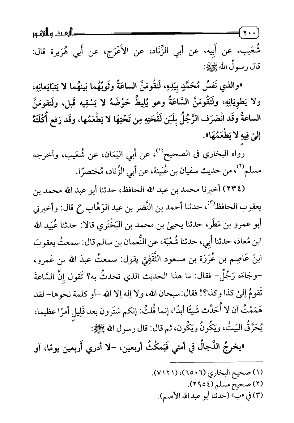 234 - أخبرنا محمد بن عبد الله الحافظ، حدثنا أبو عبد الله محمد بن يعقوب الحافظ، حدثنا أحمد بن النضر بن عبد الوهاب ح قال: وأخبرني أبو عمرو بن مطر، حدثنا يحيى بن محمد بن البختري قالا: حدثنا عبيد الله بن معاذ، حدثنا أبي، حدثنا شعبة، عن النعمان بن سالم قال: سمعت يعقوب بن عاصم بن عروة بن مسعود الثقفي يقول: سمعت عبد الله بن عمرو -وجاءه رجل- فقال: ما هذا الحديث الذي تحدث به؟ تقول إن الساعة تقوم إلى كذا وكذا؟! فقال: سبحان الله، ولا إله إلا الله-او كلمة نحوها-لقد هممت أن لا أحدث شيئا أبدا، إنما قلت: إنكم سترون بعد قليل أمرا عظيما، يحرق البيت، ويكون ويكون، ثم قال: قال رسول الله صلى الله عليه وسلم: "يخرج الدجال في أمتي فيمكث أربعين،-لا أدري أربعين يوما، أو أربعين شهرا، أو أربعين عاما- قال: فييبعث الله عيسى بن مريم، كأنه عروة بن مسعود الثقفي، فيطلبه فيهلكه، ثم يمكث الناس سبع سنين، ليس بين اثنين عداوة، ثم يرسل الله عز وجل ريحا باردة من قبل الشام، فلا يبقى على وجه الأرض أحد في قلبه مثقال ذرة من خير، أو إيمان إلا قبضته، حتى لو أن أحدكم دخل في كبد جبل لدخلت عليه، حتى تقبضه -قال: سمعتها من رسول الله صلى الله عليه وسلم-، قال: فيبقى شرار الناس في خفة الطير وأحلام السباع، لا يعرفون معروفا ولا ينكرون منكرا، فيتمثل لهم الشيطان، فيقول: ألا تستحيون؟ فيقولون: وما تأمرنا؟ فيأمرهم بعبادة الأوثان، وهم في ذلك دار رزقهم، حسن عيشهم، ثم ينفخ في الصور، فلا يسمعه أحد إلا أصغى أذنا ورفع أذنا، - وقال غيره: إلا أصغى ليتا ورفع ليتا، والليت: مجرى القرط من العنق-قال: وأول من يسمعه رجل يلوط حوض إبله، فيصعق، ثم يصعق الناس، ثم يرسل الله، -أو ينزل الله-عز وجل مطرا كأنه الطل -أو الظل، نعمان الشاك-، قال فتنبت عنه أجساد الناس، قال: ثم ينفخ فيه أخرى، فإذا هم قيام ينظرون، قال: ثم يقال: يا أيها الناس هلموا إلى ربكم، قفوهم إنهم مسؤلون، قال: ثم يقال: أخرجوا بعث النار، فيقال: من كم؟ فقال: من كل ألف تسعمائة وتسعة وتسعين، قال فذاك يوم يجعل الولدان شيبا، وذلك يوم يكشف عن ساق".