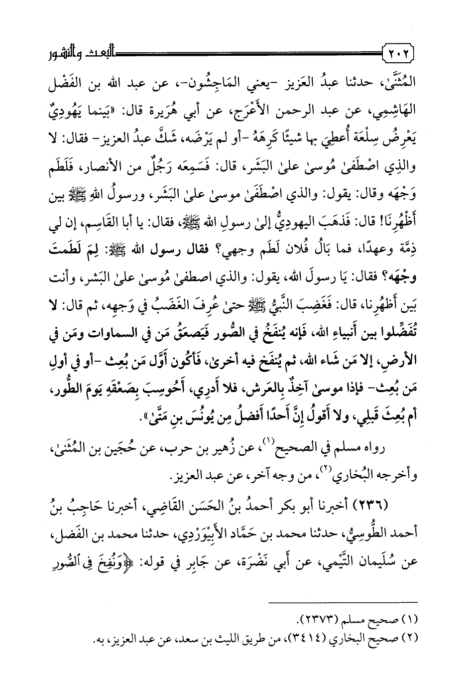 236 - أخبرنا أبو بكر أحمد بن الحسن القاضي، أخبرنا حاجب بن أحمد الطوسي، حدثنا محمد بن حماد الأبيوردي، حدثنا محمد بن الفضل، عن سليمان التيمي، عن أبي نضرة، عن جابر في قوله: {ونفخ في الصور فصعق من في السموات ومن في الأرض إلا من شاء الله} قال: "موسى، ممن استثنى الله، وذلك بأنه قد صعق مرة".