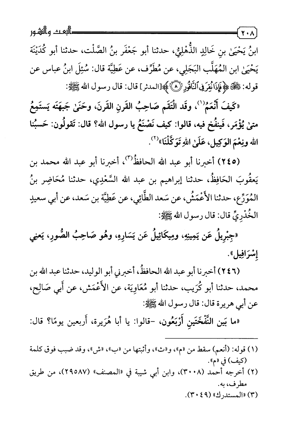 245 - أخبرنا أبو عبد الله الحافظ، أخبرنا أبو عبد الله محمد بن يعقوب الحافظ، حدثنا إبراهيم بن عبد الله السعدي، حدثنا محاضر بن المورع، حدثنا الأعمش، عن سعد الطائي، عن عطية بن سعد، عن أبي سعيد الخدري قال: قال رسول الله صلى الله عليه وسلم: "جبريل عن يمينه، وميكائيل عن يساره، وهو صاحب الصور، يعني إسرافيل".