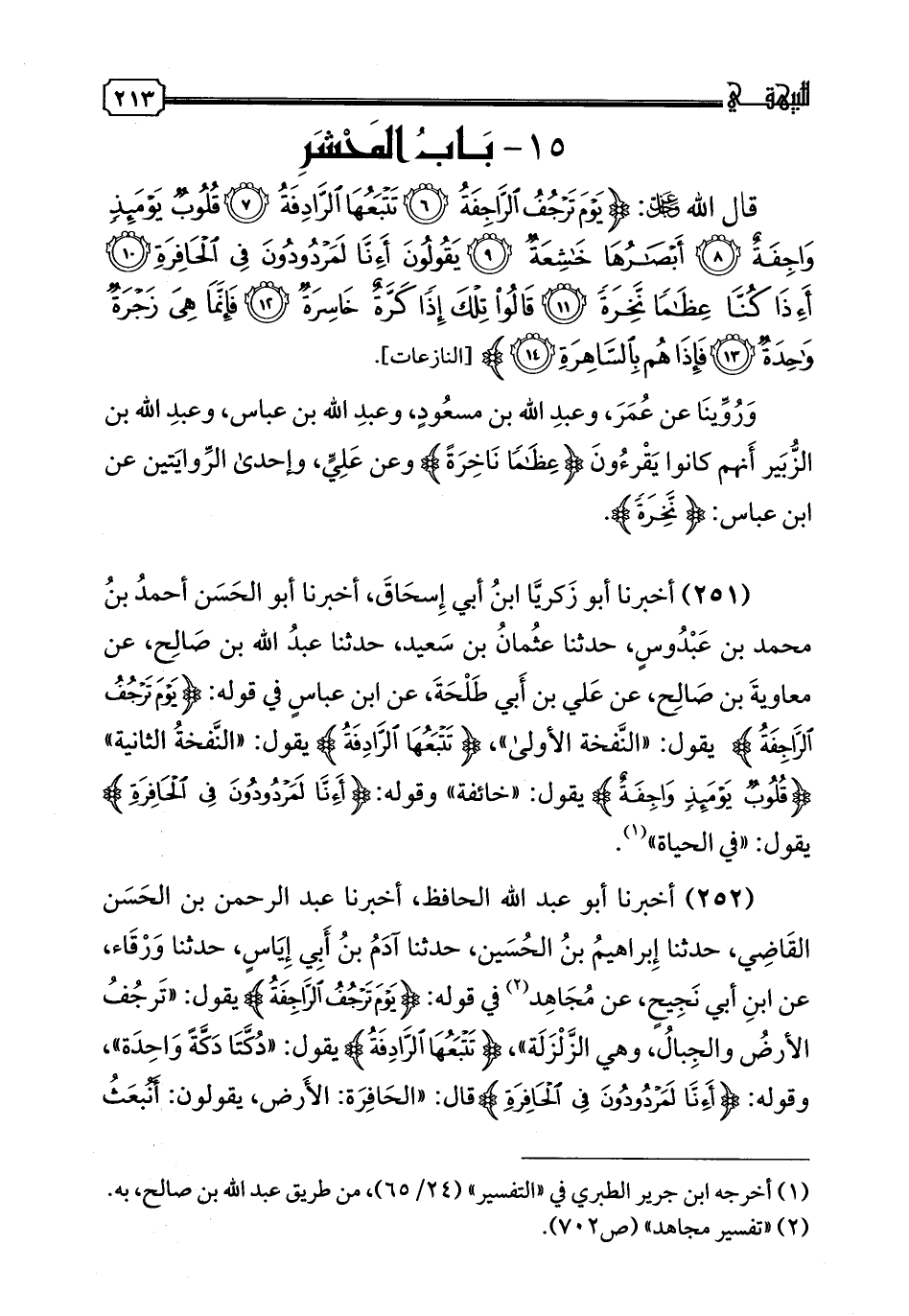 251 - أخبرنا أبو زكريا ابن أبي إسحاق، أخبرنا أبو الحسن أحمد بن محمد بن عبدوس، حدثنا عثمان بن سعيد، حدثنا عبد الله بن صالح، عن معاوية بن صالح، عن علي بن أبي طلحة، عن ابن عباس في قوله: {يوم ترجف الراجفة} يقول: "النفخة الأولى" {تتبعها الرادفة} يقول: "النفخة الثانية" {قلوب يومئذ واجفة} يقول:"خائفة" وقوله: {أءنا لمردودون في الحافرة} يقول: "في الحياة".