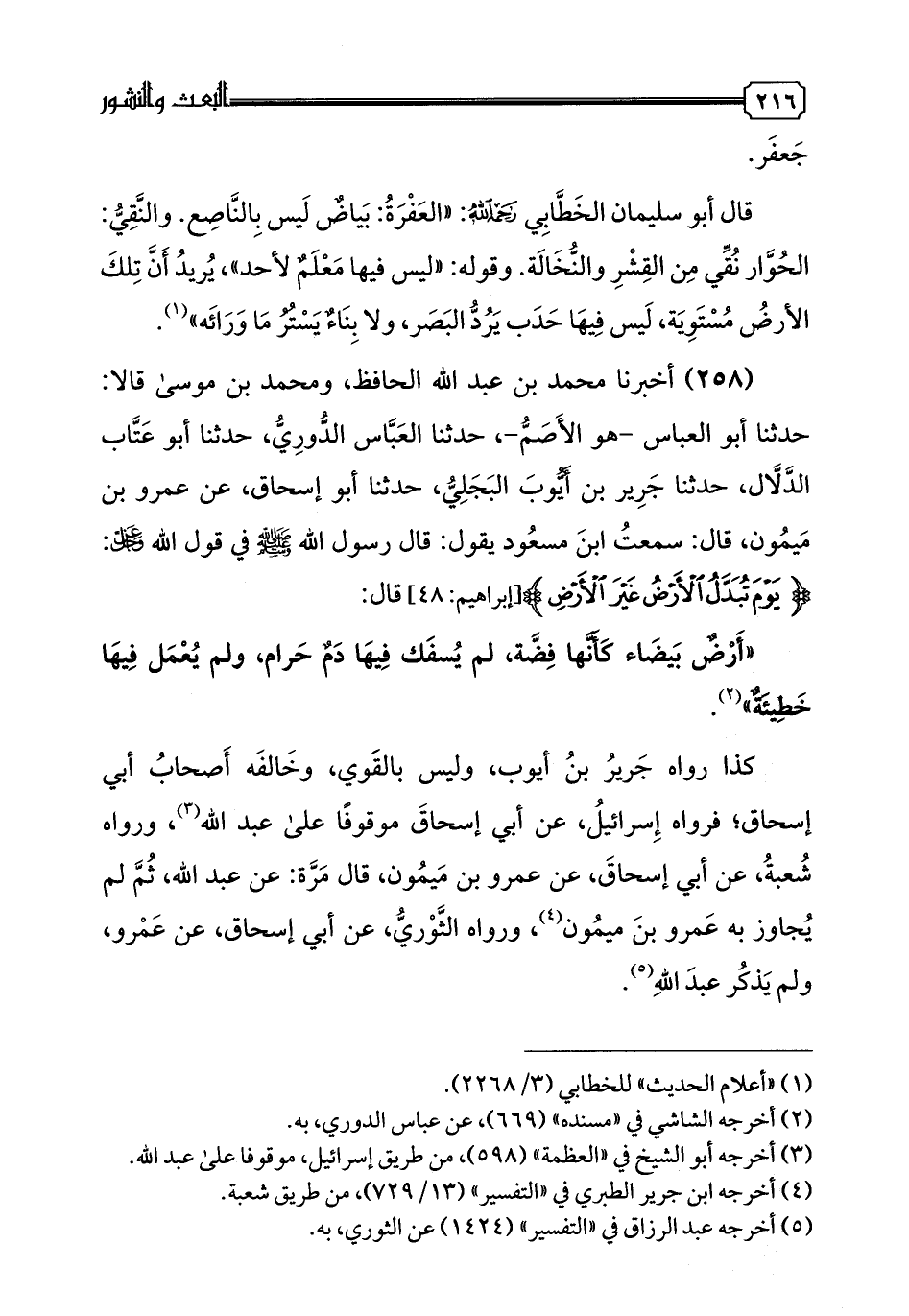 258 - أخبرنا محمد بن عبد الله الحافظ، ومحمد بن موسى قالا: حدثنا أبو العباس-هو الأصم-حدثنا العباس الدوري، حدثنا أبو عتاب الدلال، حدثنا جرير بن أيوب البجلي، حدثنا أبو إسحاق، عن عمرو بن ميمون، قال: سمعت ابن مسعود يقول: قال رسول الله صلى الله عليه وسلم في قول الله عز وجل: {يوم تبدل الأرض غير الأرض} قال: "أرض بيضاء كأنها فضة، لم يسفك فيها دم حرام، ولم يعمل فيها خطيئة".