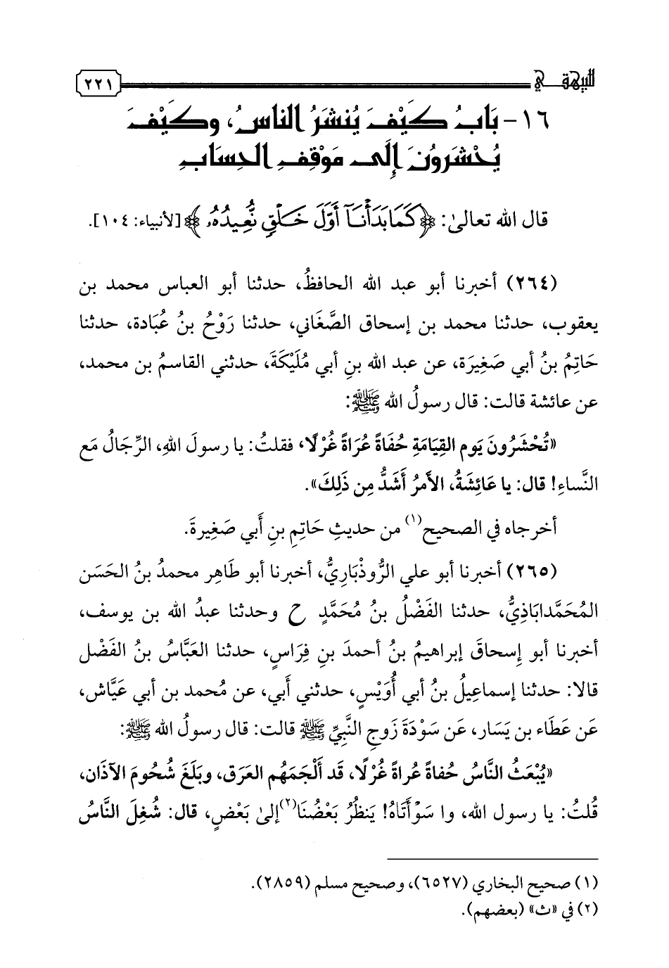 264 - أخبرنا أبو عبد الله الحافظ، حدثنا أبو العباس محمد بن يعقوب، حدثنا محمد بن إسحاق الصغاني، حدثنا روح بن عبادة، حدثنا حاتم بن أبي صغيرة، عن عبد الله بن أبي مليكة، حدثني القاسم بن محمد، عن عائشة قالت: قال رسول الله صلى الله عليه وسلم: "تحشرون يوم القيامة حفاة عراة غرلا، فقلت: يا رسول الله، الرجال مع النساء! قال: يا عائشة، الأمر أشد من ذلك".