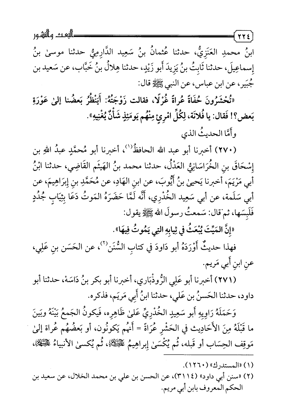 270 - أخبرنا أبو عبد الله الحافظ، أخبرنا أبو محمد عبد الله بن إسحاق بن الخراساني العدل، حدثنا محمد بن الهيثم القاضي، حدثنا ابن أبي مريم، أخبرنا يحيى بن أيوب عن ابن الهاد، عن محمد بن إبراهيم، عن أبي سلمة، عن أبي سعيد الخدري، أنه لما حضره الموت دعا بثياب جدد فلبسها، ثم قال: سمعت رسول الله صلى الله عليه وسلم يقول: "إن الميت يبعث في ثيابه التي يموت فيها". فهذا حديث أورده أبو داود في كتاب السنن، عن الحسن بن علي، عن ابن أبي مريم.