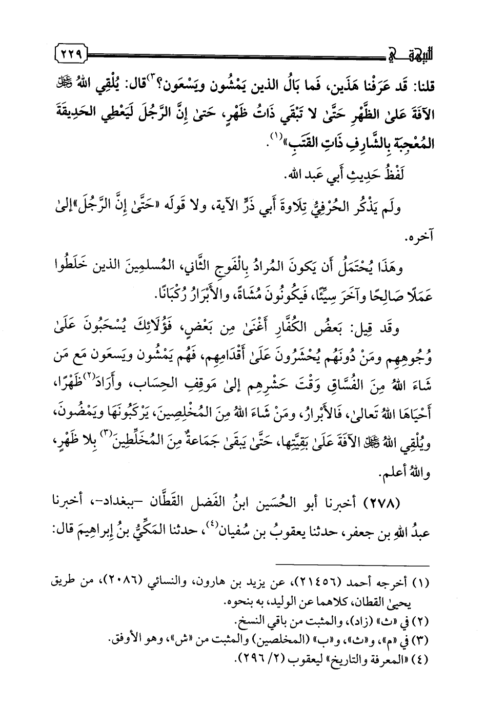 278 - أخبرنا أبو الحسين ابن الفضل القطان -ببغداد- أخبرنا عبد الله بن جعفر، حدثنا يعقوب بن سفيان، حدثنا المكي بن إبراهيم قال: بهز حدثنا، عن أبيه، عن جده قال: قلت: يا رسول الله، أين تأمرني؟ خر لي، قال: "ها هنا-ونحى بيده نحو الشام-إنكم محشورون رجالا، وركبانا، وتجرون على وجوهكم".