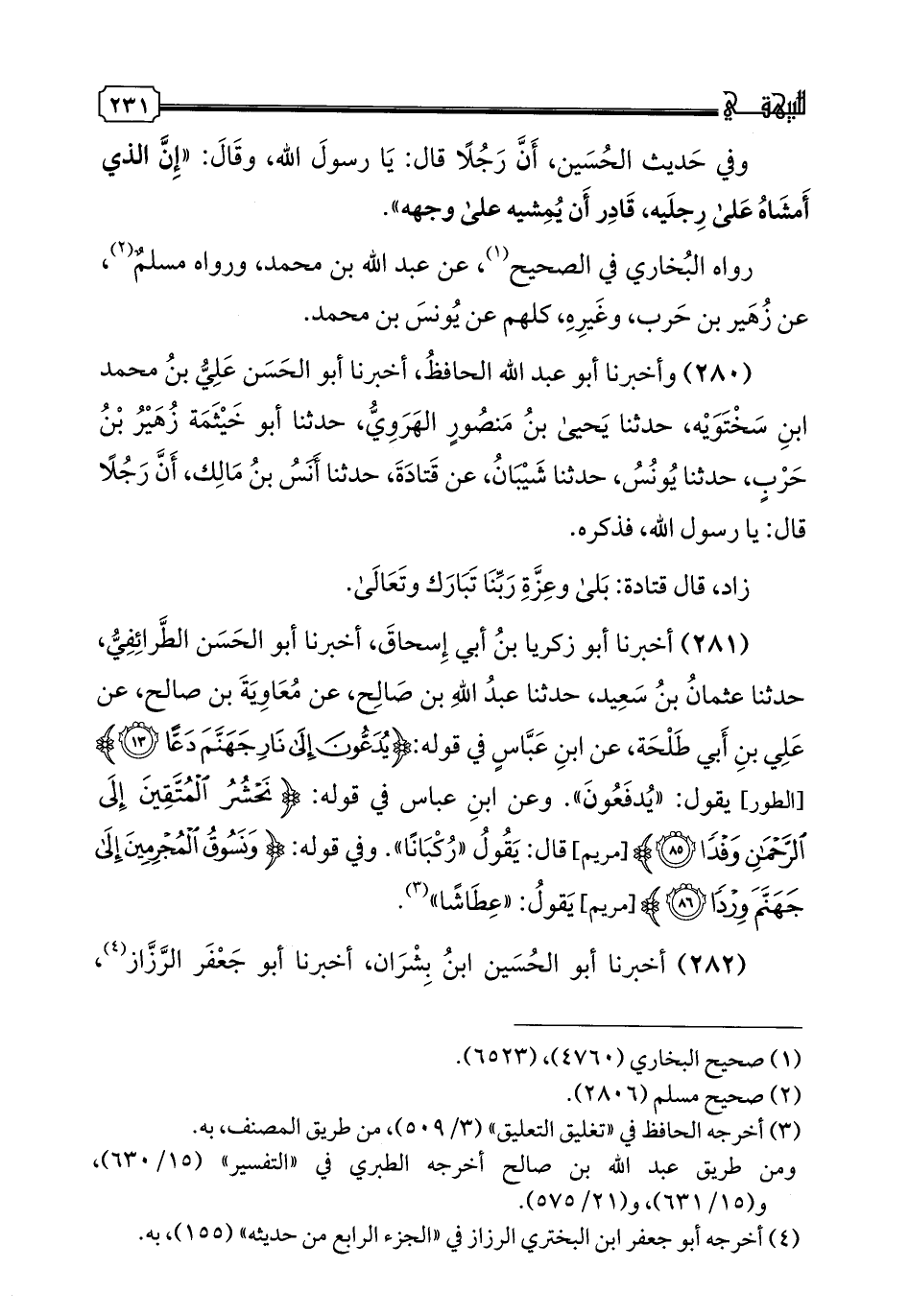 281 - أخبرنا أبو زكريا بن أبي إسحاق، أخبرنا أبو الحسن الطرائفي، حدثنا عثمان بن سعيد، حدثنا عبد الله بن صالح، عن معاوية بن صالح، عن علي بن أبي طلحة، عن ابن عباس في قوله {يدعون إلى نار جهنم دعا} يقول: "يدفعون". وعن ابن عباس في قوله: {نحشر المتقين إلى الرحمن وفدا} قال: يقول "ركبانا". وفي قوله: {ونسوق المجرمين إلى جهنم وردا} يقول: "عطاشا".