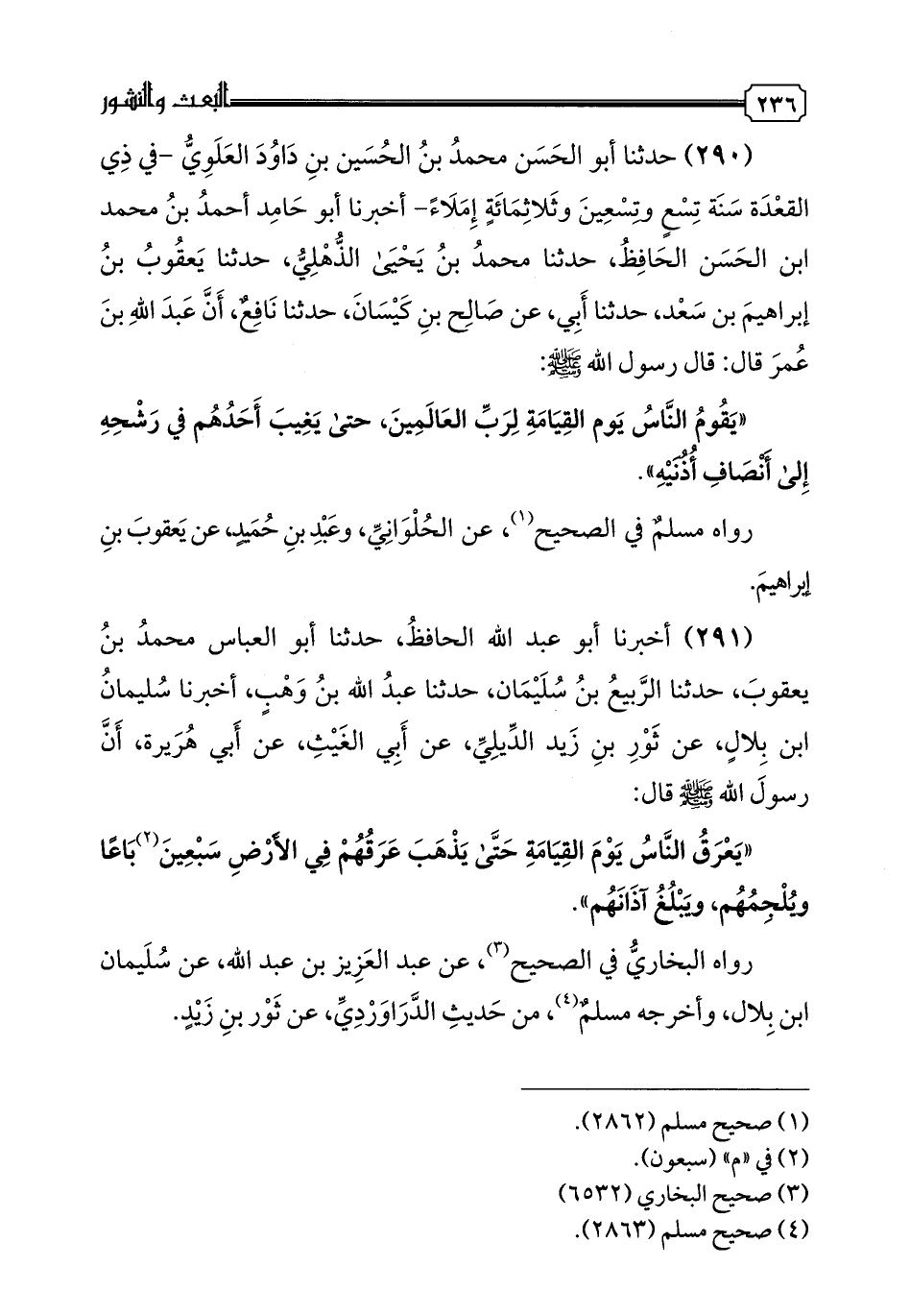 290 - حدثنا أبو الحسن محمد بن الحسين بن داود العلوي-في ذي القعدة سنة تسع وتسعين وثلاثمائة إملاء- أخبرنا أبو حامد أحمد بن محمد بن الحسن الحافظ، حدثنا محمد بن يحيى الذهلي، حدثنا يعقوب بن إبراهيم بن سعد، حدثنا أبي، عن صالح بن كيسان، حدثنا نافع، أن عبد الله بن عمر قال: قال رسول الله صلى الله عليه وسلم: "يقوم الناس يوم القيامة لرب العالمين، حتى يغيب أحدهم في رشحه إلى أنصاف أذنيه". رواه مسلم في الصحيح، عن الحلواني، وعبد بن حميد، عن يعقوب بن إبراهيم.