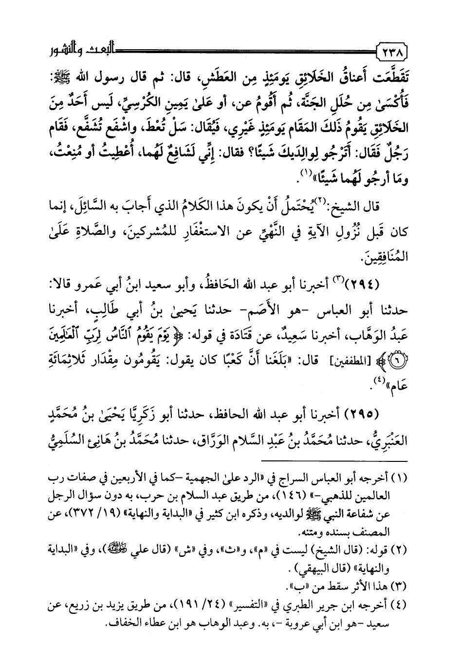 294 - أخبرنا أبو عبد الله الحافظ، وأبو سعيد ابن أبي عمرو قالا: حدثنا أبو العباس-هو الأصم-حدثنا يحيى بن أبي طالب، أخبرنا عبد الوهاب، أخبرنا سعيد، عن قتادة في قوله: {يوم يقوم الناس لرب العلمين} قال: "بلغنا أن كعبا كان يقول: يقومون مقدار ثلاثمائة عام".