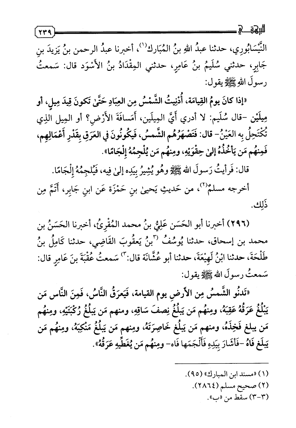 296 - أخبرنا أبو الحسن علي بن محمد المقرىء، أخبرنا الحسن بن محمد بن إسحاق، حدثنا يوسف بن يعقوب القاضي، حدثنا كامل بن طلحة، حدثنا ابن لهيعة، حدثنا أبو عشانة قال: سمعت عقبة بن عامر قال: سمعت رسول الله صلى الله عليه وسلم يقول: "تدنو الشمس من الأرض يوم القيامة، فيعرق الناس، فمن الناس من يبلغ عرقه عقبه، ومنهم من يبلغ نصف ساقه، ومنهم من يبلغ ركبتيه، ومنهم من يبلغ فخذه، ومنهم من يبلع خاصرته، ومنهم من يبلغ منكبه، ومنهم من يبلغ فاه-فأشار بيده فألجمها فاه-ومنهم عرقة". وضرب بيده على رأسه.