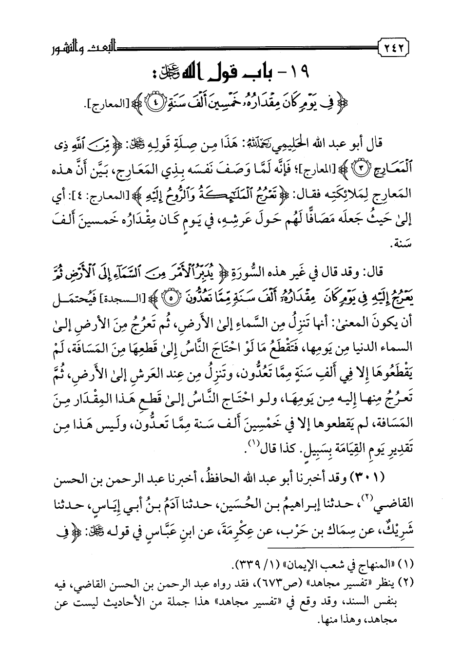 302 - أخبرنا أبو عبد الله الحافظ، أخبرنا أبو العباس الأصم، حدثنا العباس بن محمد الدوري، حدثنا قراد أبو نوح عبد الرحمن بن غزاون مولى خزاعة، حدثنا شعبة، عن سماك، عن عكرمة في قوله عز وجل {يوم كان مقداره خمسين ألف سنة} قال: "ذلك يوم القيامة". قال الشيخ: هذا المقدار الذي روي عن عكرمة لا يخالف قول الحليمي، ويحتمل أن يكون عروج الملائكة يوم القيامة هكذا يكون، وعروجهم قبل يوم القيامة كما قال في سورة السجدة، وذلك لما يشاهدون يوم القيامة من عظمة الله تعالى وشدة غضبه، فتفتر قواهم، فيحتاجون للعروج في مدة أطول مما كانوا يحتاجون إليها قبل.