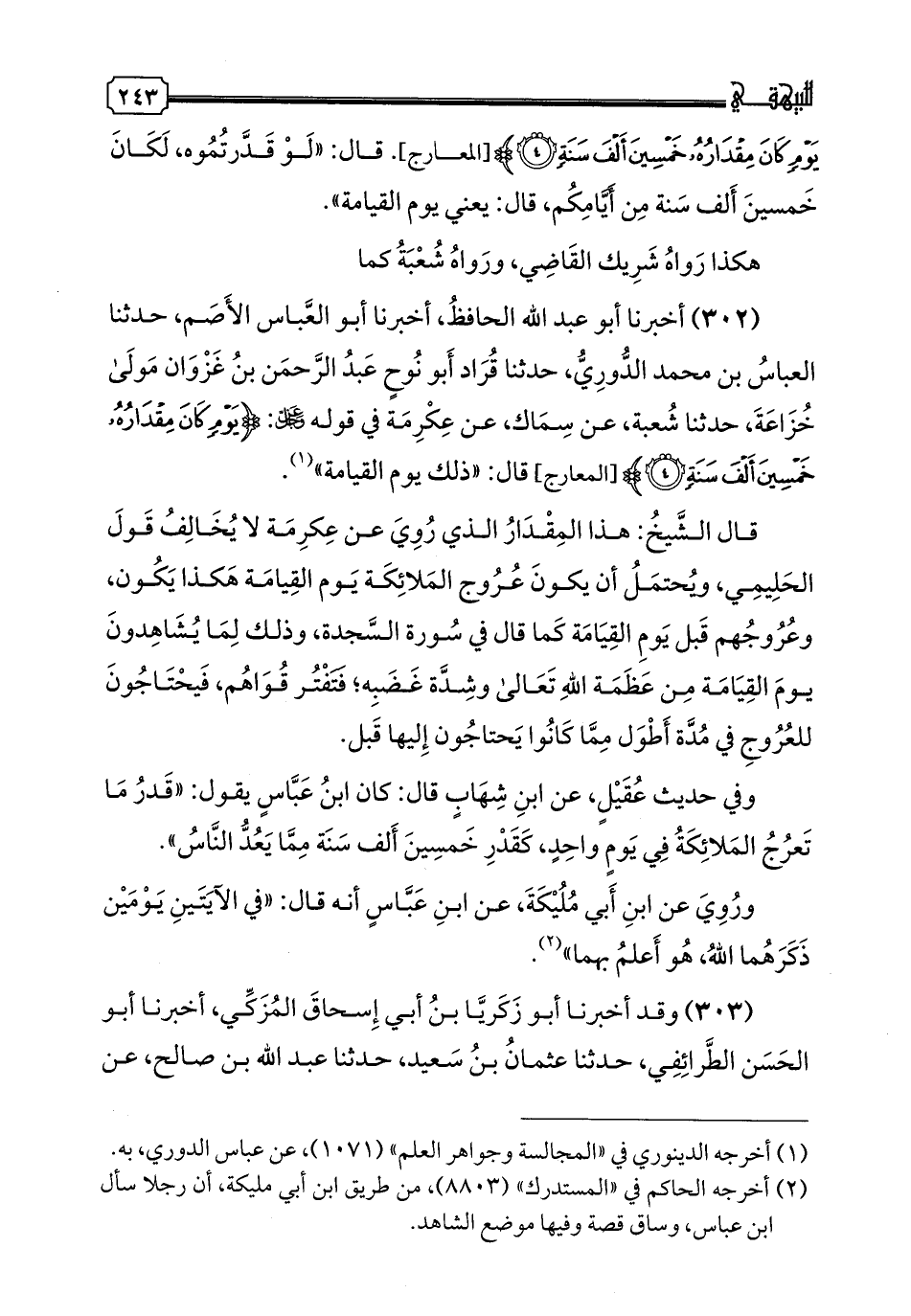 303 - وقد أخبرنا أبو زكريا بن أبي إسحاق المزكي، أخبرنا أبو الحسن الطرائفي، حدثنا عثمان بن سعيد، حدثنا عبد الله بن صالح، عن معاوية بن صالح، عن علي بن أبي طلحة، عن ابن عباس في قوله: {يعرج إليه في يوم كان مقداره ألف سنة مما تعدون} قال: "هذا في الدنيا، تعرج الملائكة في يوم كان مقداره ألف سنة، وقوله: {في يوم كان مقداره خمسين ألف سنة} فهذا يوم القيامة، جعله الله على الكافر مقدار خمسين ألف سنة". وهذا لا يحتمل ما قال الحليمي.
