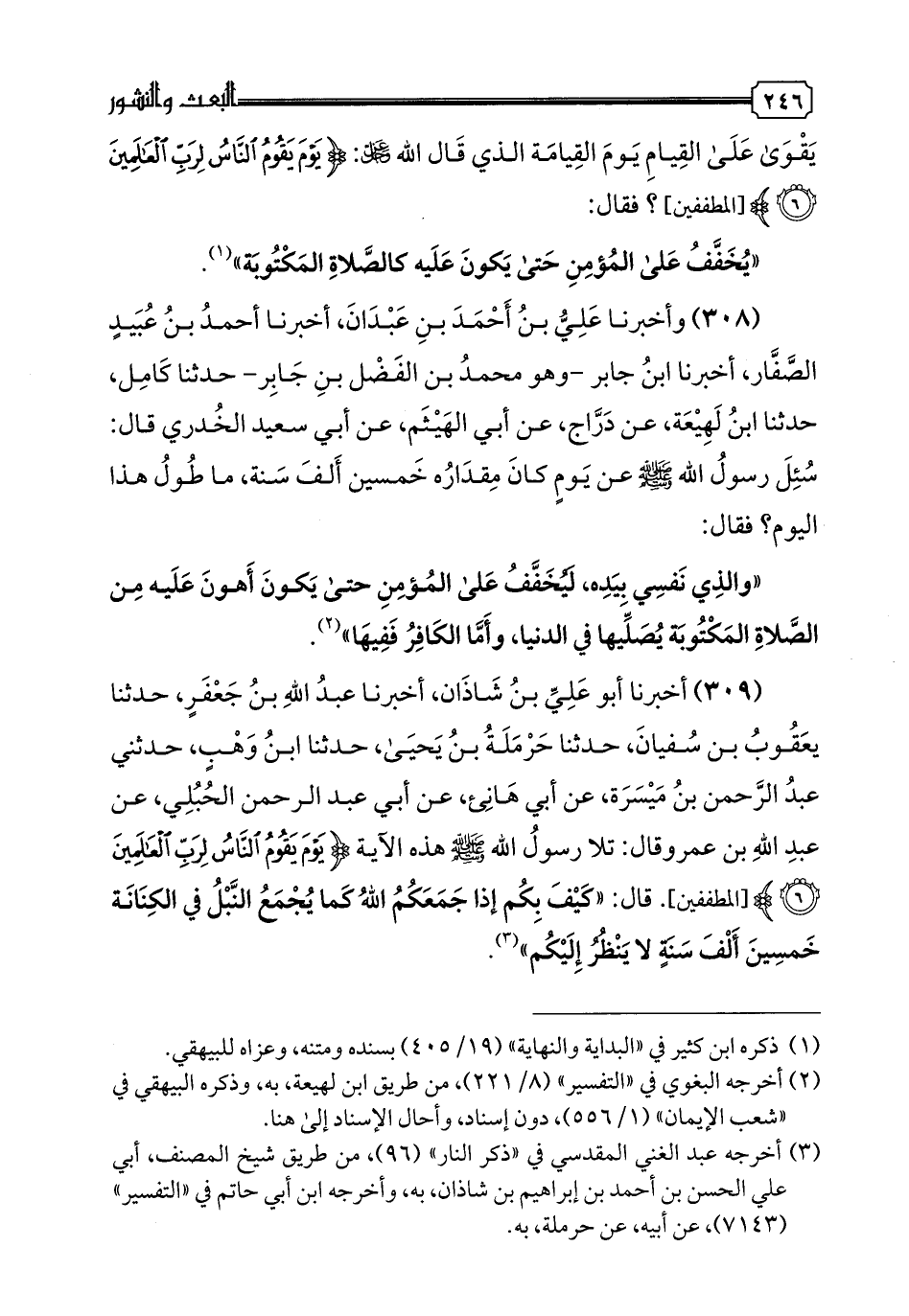 309 - أخبرنا أبو علي بن شاذان، أخبرنا عبد الله بن جعفر، حدثنا يعقوب بن سفيان، حدثنا حرملة بن يحيى، حدثنا ابن وهب، حدثني عبد الرحمن بن ميسرة، عن أبي هانىء، عن أبي عبد الرحمن الحبلي، عن عبد الله بن عمرو قال: تلا رسول الله صلى الله عليه وسلم هذه الآية {يوم يقوم الناس لرب العالمين}. قال: "كيف بكم إذا جمعكم الله كما يجمع النبل في الكنانة خمسين ألف سنة لا ينظر إليكم". وفيما ذكر حماد بن زيد، عن أيوب قال: قال الحسن: "ما ظنك بقوم قاموا على أقدامهم خمسين ألف سنة، لم يأكلوا فيها أكله، ولم يشربوا فيها شربة، حتى إذا انقطعت أعناقهم عطشا واحترقت أجوافهم جوعا انصرف بهم إلى النار، فسقوا من عين آنية قال: قد أنى حرها، واشتد نضجها. وذهب الكلبي في تفسير قوله: {في يوم كان مقداره خمسين ألف سنة} إلى معنى آخر -وهو يروي تفسيره عن أبي صالح، عن ابن عباس- فقال: "يعني لو ولي محاسبة العباد غير الله، لم يفرغ منه في خمسين ألف سنة". وبلغني عن معمر بن راشد، عن ابن أبي نجيح، عن مجاهد. قال معمر: وبلغني أيضا عن عكرمة {في يوم كان مقداره خمسين ألف سنة}. قال: "الدنيا من أولها إلى آخرها يوم، مقداره خمسين ألف سنة، لا يدري أحدكم كم مضى، وكم بقي، إلا الله". وهذا فيما رواه يوسف بن يعقوب، عن محمد بن عبيد، عن محمد بن ثور، عن معمر.