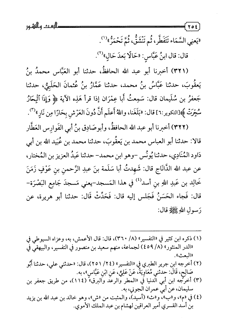 321 - أخبرنا أبو عبد الله الحافظ، حدثنا أبو العباس محمد بن يعقوب، حدثنا عباس بن محمد، حدثنا عمار بن عثمان الحلبي، حدثنا جعفر بن سليمان قال: سمعت أبا عمران إذا قرأ هذه الآية {وإذا البحار سجرت} قال: "بلغنا، والله أعلم أن دون العرش بحارا من نار".