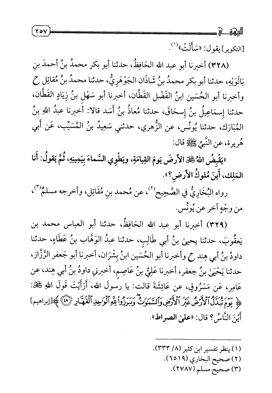 328 - أخبرنا أبو عبد الله الحافظ، حدثنا أبو بكر محمد بن أحمد بن بالويه، حدثنا أبو بكر محمد بن شاذان الجوهري، حدثنا محمد بن مقاتل ح وأخبرنا أبو الحسين بن الفضل القطان، أخبرنا أبو سهل بن زياد القطان، حدثنا إسماعيل بن إسحاق، حدثنا معاذ بن أسد قالا: أخبرنا عبد الله بن المبارك، حدثنا يونس، عن الزهري، حدثني سعيد بن المسيب، عن أبي هريرة عن النبي صلى الله عليه وسلم قال: "يقبض الله عز وجل الأرض يوم القيامة، ويطوي السماء بيمينه، ثم يقول: أنا الملك، أين ملوك الأرض؟ ".