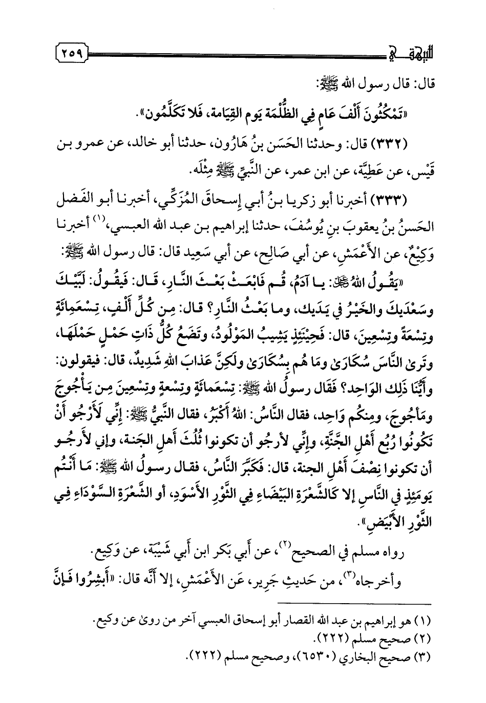 333 - أخبرنا أبو زكريا بن أبي إسحاق المزكي، أخبرنا أبو الفضل الحسن بن يعقوب بن يوسف، حدثنا إبراهيم بن عبد الله العبسي، أخبرنا وكيع، عن الأعمش، عن أبي صالح، عن أبي سعيد قال: قال رسول الله صلى الله عليه وسلم: "يقول الله عز وجل: يا آدم، ثم فابعث بعث النار، قال: فيقول: لبيك وسعديك والخير في يديك، وما بعث النار؟ قال: من كل ألف، تسعمائة وتسعة وتسعين، قال: فحينئذ يشيب المولود، وتضع كل ذات حمل حملها، وترى الناس سكارى وما هم بسكارى ولكن عذاب الله شديد، قال: فيقولون: وأينا ذلك الواحد؟ فقال رسول الله صلى الله عليه وسلم: تسعمائة وتسعة وتسعين من يأجوج ومأجوج، ومنكم واحد، فقال الناس: الله أكبر، فقال النبي صلى الله عليه وسلم: إني لأرجو أن تكونوا ربع أهل الجنة، وإني لأرجو أن تكونوا ثلث أهل الجنة، وإني لأرجو أن تكونوا نصف أهل الجنة، قال: فكبر الناس، فقال رسول الله صلى الله عليه وسلم: ما أنتم يومئذ في الناس إلا كالشعرة البيضاء في الثور الأسود، أو الشعرة السوداء في الثور الأبيض".