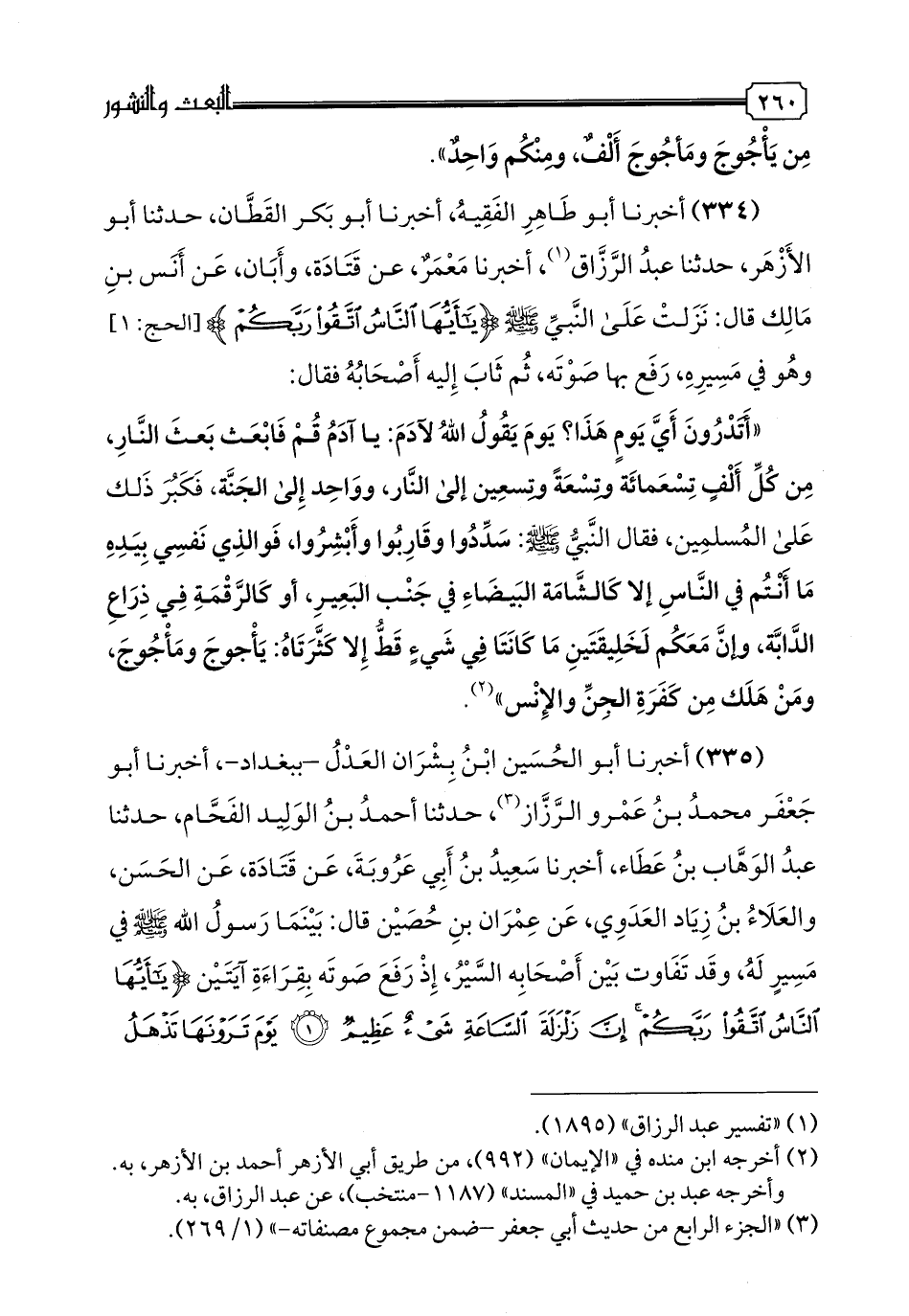 335 - أخبرنا أبو الحسين بن بشران العدل -ببغداد- أخبرنا أبو جعفر محمد بن عمرو الرزاز، حدثنا أحمد بن الوليد الفحام، حدثنا عبد الوهاب بن عطاء، أخبرنا سعيد بن أبي عروبة، عن قتادة، عن الحسن، والعلاء بن زياد العدوي، عن عمران بن حصين قال: بينما رسول الله صلى الله عليه وسلم في مسير له، وقد تفاوت بين أصحابه السير، إذ رفع صوته بقراءة آيتين {يأيها الناس اتقوا ربكم إن زلزلة الساعة شيء عظيم (1) يوم ترونها تذهل كل مرضعة عما أرضعت وتضع كل ذات حمل حملها وترى الناس سكرى وما هم بسكرى ولكن عذاب الله شديد (2)} فحث أصحابه المطي لما سمعوا ذلك، وظنوا أنه عند قول يقوله، فلما ناشبوا حوله قال: أتدرون أي يوم ذلك اليوم؟ " قالوا: الله ورسوله أعلم. قال: "ذلك يوم ينادى فيه آدم، يناديه ربه عز وجل، قم يا آدم فابعث بعثا إلى النار، فيقول: وكم بعث النار؟ فيقول: من كل ألف تسعمائة وتسعة وتسعين في النار، وواحد في الجنة، فلما سمعوا بذلك -أصحابه- أبلسوا، حتى ما أوضحوا بضاحكة، فلما رأى نبي الله صلى الله عليه وسلم الذي عند أصحابه قال: "اعملوا وأبشروا، فوالذي نفس محمد بيده، إن معكم لخليقتين ما كانت مع أحد قط إلا كثرتاه، مع من هلك من بني آدم وبني إبليس، قالوا: ومن هما يا نبي الله؟ قال: يأجوج ومأجوج، قال: فسري عن القوم، فقال: اعملوا وأبشروا، فوالذي نفس محمد بيده، ما أنتم في الناس يوم القيامة إلا كالشامة في جنب البعير، أو كالرقمة في ذراع الدابة". قال قتادة: "إن أهل الإسلام قليل في كثير، فأحسنوا بالله الظن، وارفعوا الرغبة إليه، ولتكن رحمته منكم أوثق عندكم من أعمالكم، فإنه لن ينجو ناج إلا برحمة الله، ولن يهلك هالك إلا بعمله".