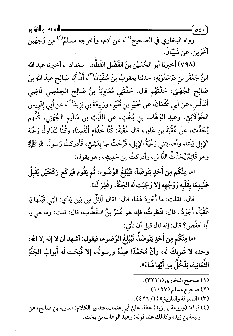 798 - أَخْبَرَنَا أَبُو الْحُسَيْنِ بْنُ الْفَضْلِ الْقَطَّانُ، -بِبَغْدَادَ-، أخبرنا عبد الله بن جعفر بن درستويه، حدثنا يعقوب بن سفيان، أن أبا صالح عبد الله بن صالح الجهني حدثهم قال: حدثتي مُعَاوِيَةُ بْنُ صَالِحٍ الْحِمْصِيُّ، قَاضِي أَنْدَلُسَ، عَنْ أَبِي عُثْمَانَ، عَنْ جُبَيْرِ بْنِ نُفَيْرٍ، وَرَبِيعَةَ بْنِ يَزِيدَ، عَنْ أَبِي إِدْرِيسَ الْخَوْلَانِيِّ، وَعَبْدِ الْوَهَّابِ بْنِ بُخْتٍ، عَنِ اللَّيْثِ بْنِ سُلَيْم الْجُهَنِيِّ، كُلُّهُمْ يُحَدِّثُ، عَنْ عُقْبَةَ بْنِ عَامِرٍ، قَالَ عُقْبَةُ: كُنَّا خُدَّامَ أَنْفُسِنَا، وَكُنَّا نَتَدَاوَلُ رَعِيَّةَ الْإِبِلِ بَيْنَنَا، وَأصابتني رعية الْإِبِلِ، فَرُحْتُ بِهَا بِعَشِيٍّ، فَأَدْرَكْتُ رَسُولَ اللَّهِ صَلَّى اللهُ عَلَيْهِ وَسَلَّمَ وَهُوَ قَائِمٌ يُحَدِّثُ النَّاسَ، وَأَدْرَكْتُ مِنْ حَدِيثِهِ، وَهُوَ يَقُولُ: «مَا مِنْكُمْ مِنْ أَحَدٍ يَتَوَضَّأُ، فَيَبْلُغُ الْوُضُوءَ، ثُمَّ يَقُومُ فَيَرْكَعُ رَكْعَتَيْنِ يُقْبِلُ عَلَيْهِمَا بِقَلْبِهِ وَوَجْهِهِ إِلَّا وَجَبَتْ لَهُ الْجَنَّةُ، وَغُفِرَ لَهُ»، قَالَ: فَقُلْتُ: مَا أَجْوَدُ هَذَا، قَالَ: فَقَالَ قَائِلٌ مِنْ بَيْنِ يَدَي: الَّتِي قَبْلَهَا يَا عُقْبَةُ أَجْوَدُ، قَالَ: فَنَظَرْتُ فَإِذَا هُوَ عُمَرُ بْنُ الْخَطَّابِ، قَالَ: قُلْتُ: وَمَا هِيَ يَا أَبَا حَفْصٍ؟ قَالَ: إِنَّهُ قَالَ قَبْلَ أَنْ تَأتِيَ: " مَا مِنْكُمْ مِنْ أَحَدٍ يَتَوَضَّأُ، فَيَبْلُغُ الْوُضُوءَ، فَيَقُولُ: أَشْهَدُ أَنْ لَا إِلَهَ إِلَّا اللَّهُ، وَحْدَهُ لَا شَرِيكَ لَهُ، وَأَنَّ مُحَمَّدًا عَبْدُهُ وَرَسُولُهُ، إِلَّا فُتِحَتْ لَهُ أَبْوَابُ الْجَنَّةِ الثَّمَانِيَةِ يَدْخُلُ مِنْ أَيِّهَا شَاءَ " أَخْرَجَهُ مُسْلِمٌ فِي الصَّحِيحِ منْ حَدِيثِ عَبْدِ الرَّحْمَنِ بْنِ مَهْدِيٍّ، عَنْ مُعَاوِيَةَ بْنِ صَالِحٍ بِالْإِسْنَادَيْنِ، دُونَ إِسْنَادِ عَبْدِ الْوَهَّابِ.