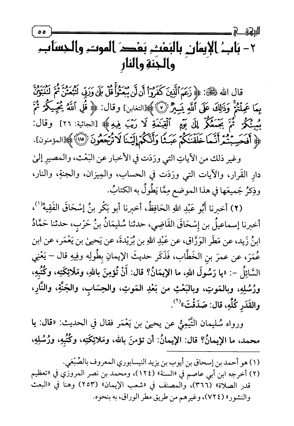 2 - أَخْبَرَنَا أَبُو عَبْدِ اللَّهِ الْحَافِظُ , أَخبرنا أَبُو بَكْرِ بْنُ إِسْحَاقَ الْفَقِيهُ , أَخبرنا إِسْمَاعِيلُ بْنُ إِسْحَاقَ الْقَاضِي , حدثنا سُلَيْمَانُ بْنُ حَرْبٍ , حدثنا حَمَّادُ بْنُ زَيْدٍ , عَنْ مَطَرٍ الْوَرَّاقِ , عَنْ عَبْدِ اللَّهِ بْنِ بُرَيْدَةَ , عَنْ يَحْيَى بْنِ يَعْمُرَ , عَنْ ابْنِ عُمَرَ , عن عُمَرُ بْنُ الْخَطَّابِ, فذكر حديث الإيمان بطوله وفيه قال-يعني السائل-: "يَا رَسُولَ اللَّهِ , مَا الْإِيمَانُ؟ قَالَ: «أَنْ تُؤْمِنَ بِاللَّهِ , وَمَلَائِكَتِهِ , وَكُتُبِهِ , وَرُسُلِهِ , وَبِالْمَوْتِ , وَبِالْبَعْثِ مِنْ بَعْدِ الْمَوْتِ , وَالْحِسَابِ , وَالْجَنَّةِ , وَالنَّارِ , وَالْقَدَرِ كُلِّهِ» , قَالَ: صَدَقْتَ ".