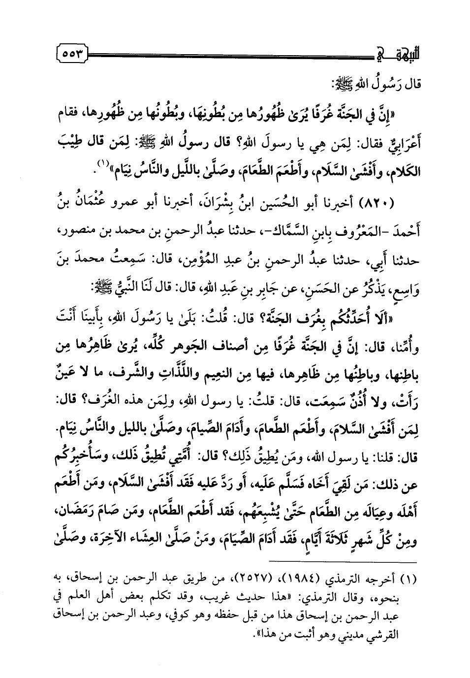 820 - أَخْبَرَنَا أَبُو الْحُسَيْنِ بْنُ بُشْرَانَ، أَخبرنا أَبُو عَمْرٍو عُثْمَانُ بْنُ أَحْمَدَ -الْمَعْرُوفُ بِابْنِ السَّمَّاكِ-، حدثنا عَبْدُ الرَّحْمَنِ بْنُ مُحَمَّدِ بْنِ مَنْصُورٍ، حدثنا أَبِي، حدثنا عَبْدُ الرَّحْمَنِ بْنُ عَبْد الْمُؤْمِنِ، قَالَ: سَمِعْتُ مُحَمَّدَ بْنَ وَاسِعٍ، يَذْكُرُ عَنِ الْحَسَنِ، عَنْ جَابِرِ بْنِ عَبْدِ اللَّهِ، قَالَ: قَالَ لَنَا النَّبِيُّ صَلَّى اللهُ عَلَيْهِ وَسَلَّمَ: «أَلَا أُحَدِّثُكُمْ بِغُرَفِ الْجَنَّةِ؟»، قَالَ: قُلْتُ: بَلَى يَا رَسُولَ اللَّهِ بِأَبِينَا أَنْتَ وَأَمِّنَا، قَالَ: «إِنَّ فِي الْجَنَّةِ غُرَفًا مِنْ أَصْنَافِ الْجَوْهَرِ كُلِّهِ يُرَى ظَاهِرُهَا مِنْ بَاطِنِهَا، وَبَاطِنُهَا مِنْ ظَاهِرِهَا، فِيهَا مِنَ النَّعِيمِ وَاللَّذَّاتِ وَالشرَفِ، مَا لَا عَيْنٌ رَأَتْ، وَلَا أُذُنٌ سَمِعَتْ»، قَالَ: قُلْتُ: يَا رَسُولَ اللَّهِ وَلِمَنْ هَذِهِ الْغُرَفُ؟ قَالَ: «لِمَنْ أَفْشَى السَّلَامَ، وَأَطْعَمَ الطَّعَامَ، وَأَدَامَ الصِّيَامَ، وَصَلَّى بِاللَّيْلِ وَالنَّاسُ نِيَامٌ»، قَالَ: قُلْنَا: يَا رَسُولَ اللَّهِ وَمَنْ يُطِيقُ ذَلِكَ؟ قَالَ: " أُمَّتِي تُطِيقُ ذَلِكَ، وَسَأُخْبِرُكُمْ عَنْ ذَلِكَ: مَنْ لَقِيَ أَخَاهُ فَسَلَّمَ عَلَيْهِ أَوْ رَدَّ عَلَيْهِ فَقَدْ أَفْشَى السَّلَامَ، وَمَنْ أَطْعَمَ أَهْلَهُ وَعِيَالَهُ مِنَ الطَّعَامِ حَتَّى يُشْبِعَهُمْ، فَقَدْ أَطْعَمَ الطَّعَامَ، وَمَنْ صَامَ رَمَضَانَ، وَمِنْ كُلِّ شَهْرٍ ثَلَاثَةَ أَيَّامٍ، فَقَدْ أَدَامَ الصِّيَامَ، وَمَنْ صَلَّى الْعِشَاءَ الْآخِرَةَ، وَصَلَّى الْغَدَاةَ فِي جَمَاعَةٍ، فَقَدْ صَلَّى اللَّيْلَ وَالنَّاسُ نِيَامٌ، الْيَهُودُ، وَالنَّصَارَى، وَالْمَجُوسُ "