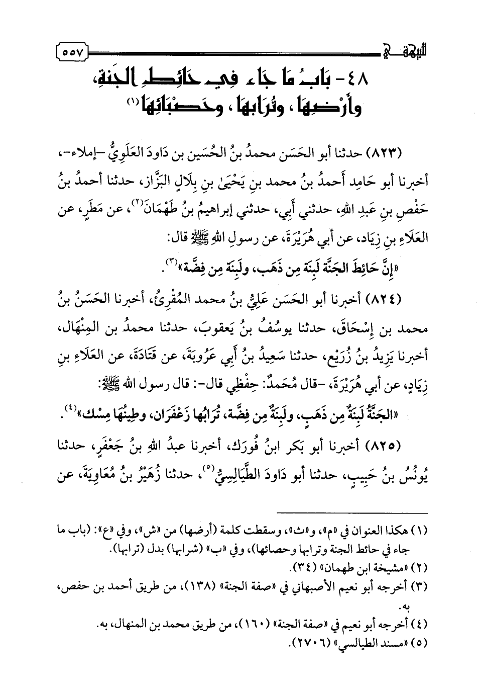 823 - حَدَّثَنَا أبو الحسن محمد بْنُ الْحُسَيْنِ بْنِ دَاوُدَ الْعَلَوِيُّ -إِمْلَاءً-، أَخبرنا أَبُو حَامِدٍ أَحْمَدُ بْنُ مُحَمَّدِ بْنِ يَحْيَى بْنِ بِلَالٍ الْبَزَّازُ، حدثنا أَحْمَدُ بْنُ حَفْصِ بْنِ عَبْدِ اللَّهِ، حَدَّثَنِي أَبِي، حَدَّثَنِي إِبْرَاهِيمُ بْنُ طَهْمَانَ، عَنْ مَطَرٍ، عَنِ الْعَلَاءِ بْنِ زِيَادٍ، عَنْ أَبِي هُرَيْرَةَ، عَنْ رَسُولِ اللَّهِ صَلَّى اللهُ عَلَيْهِ وَسَلَّمَ قَالَ: «إِنَّ حَائِطَ الْجَنَّةِ لَبِنَةٌ مِنْ ذَهَبٍ، وَلَبِنَةٌ مِنْ فِضَّةٍ»