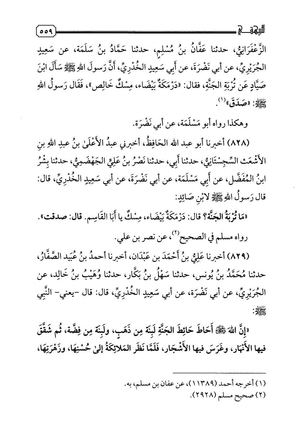 828 - أَخْبَرَنَا أَبُو عَبْدِ اللَّهِ الْحَافِظُ، أَخْبَرَنِي عَبْدُ الْأَعْلَى بْنُ عَبْدِ اللَّهِ بْنِ الْأَشْعَثِ السِّجِسْتَانِيُّ، حدثنا أَبِي، حدثنا نَصْرُ بْنُ عَلِيٍّ الْجَهْضَمِيُّ، حدثنا بِشْرُ بْنُ الْمفَضْلِ، عَنْ أَبِي مَسْلَمَةَ، عَنْ أَبِي نَضْرَةَ، عَنْ أَبِي سَعِيدٍ الْخُدْرِيِّ، قَالَ: قَالَ رَسُولُ اللَّهِ صَلَّى اللهُ عَلَيْهِ وَسَلَّمَ لِابْنِ صَائِدٍ مَا تُرْبَةُ الْجَنَّةِ؟ قَالَ: «دَرْمَكَةٌ بَيْضَاءُ مِسْكٌ»، يَا أَبَا الْقَاسِمِ قَالَ: «صَدَقْتَ»