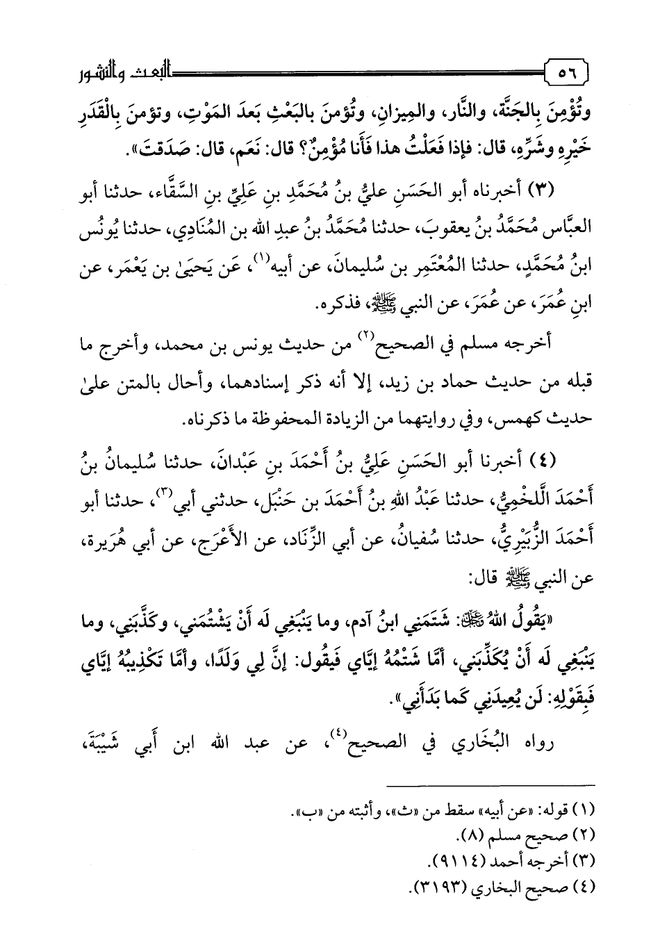 4 - أخبرنا أبو الحسن علي بن أحمد بن عبدان، حدثنا سليمان بن أحمد اللخمي، حدثنا عبد الله بن أحمد بن حنبل، حدثني أبي، حدثنا أبو أحمد الزبيري، حدثنا سفيان، عن أبي الزناد، عن الأعرج، عن أبي هريرة، عن النبي صلى الله عليه وسلم قال: "يقول الله عز وجل: شتمني ابن آدم، وما ينبغي له أن يشتمني، وكذبني، وما ينبغي له أن يكذبني، أما شتمه إياي فيقول: إن لي ولدا، وأما تكذيبه إياي فبقوله: لن يعيدني كما بدأني".
