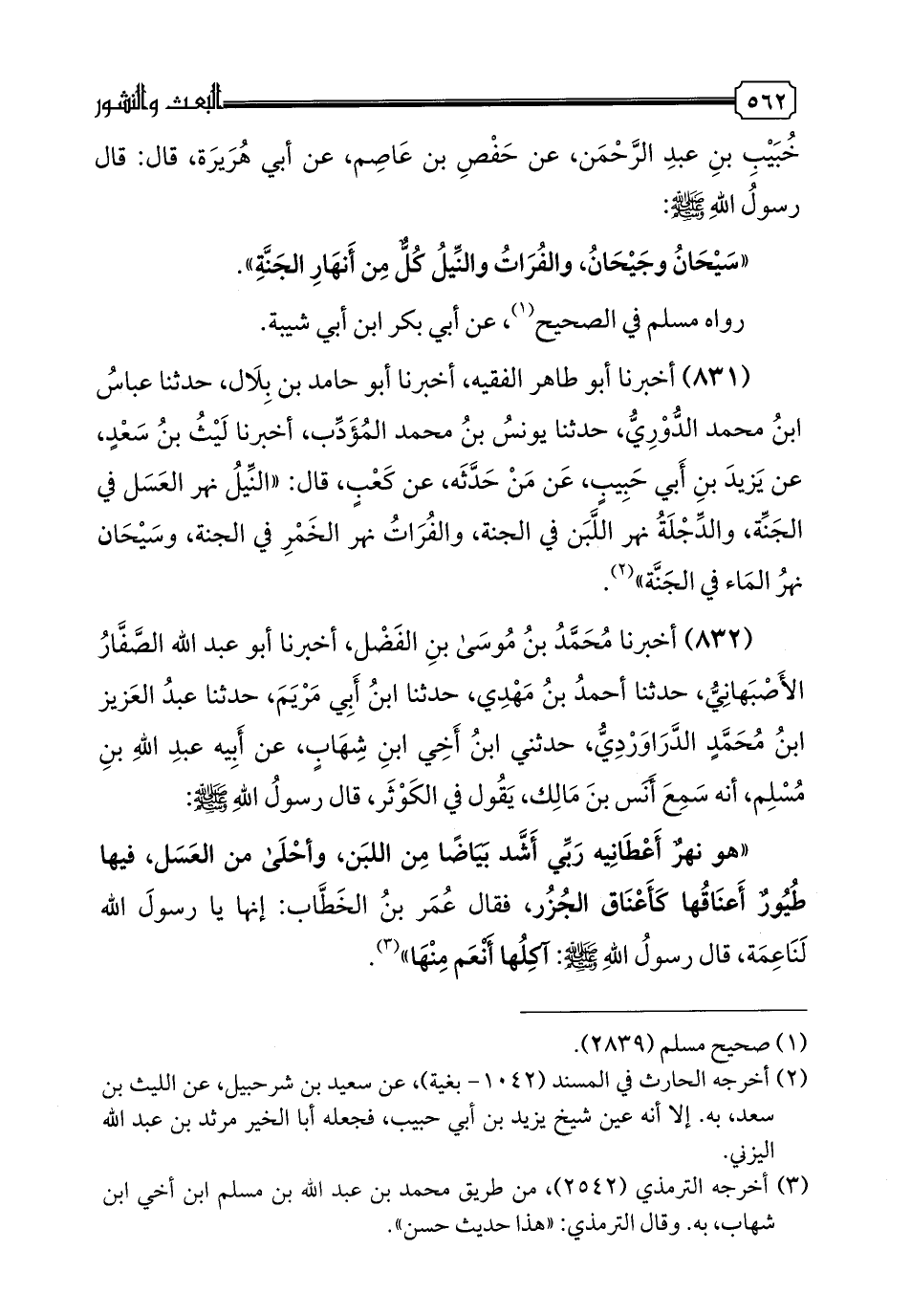 832 - أَخْبَرَنَا مُحَمَّدُ بْنُ مُوسَى بْنِ الْفَضْلِ، أَخبرنا أَبُو عَبْدِ اللَّهِ الصَّفَّارُ الْأَصْبَهَانِيُّ، حدثنا أَحْمَدُ بْنُ مَهْدِيٍّ، حدثنا ابْنُ أَبِي مَرْيَمَ، حدثنا عَبْدُ الْعَزِيزِ بْنُ مُحَمَّدٍ الدَّرَاوَرْدِيُّ، حَدَّثَنِي ابْنُ أَخِي ابْنُ شِهَابٍ، عَنْ أَبِيهِ عَبْدِ اللَّهِ بْنِ مُسْلِمٍ، أَنَّهُ سَمِعَ أَنَسَ بْنَ مَالِكٍ، يَقُولُ فِي الْكَوْثَرِ، قَالَ رَسُولُ اللَّهِ: «هُوَ نَهْرٌ أَعْطَانِيهِ رَبِّي أَشَدَّ بَيَاضًا مِنَ اللَّبَنِ، وَأَحْلَى مِنَ الْعَسَلِ فِيهَا طُيُورٌ أَعْنَاقُهَا كَأَعْنَاقِ الْجُزُرِ»، فَقَالَ عُمَرُ بْنُ الْخَطَّابِ: إِنَّهَا يَا رَسُولَ اللَّهِ لَنَاعِمَةُ، قَالَ رَسُولُ اللَّهِ صَلَّى اللهُ عَلَيْهِ وَسَلَّمَ: «آكْلُهَا أَنْعَمُ مِنْهَا»