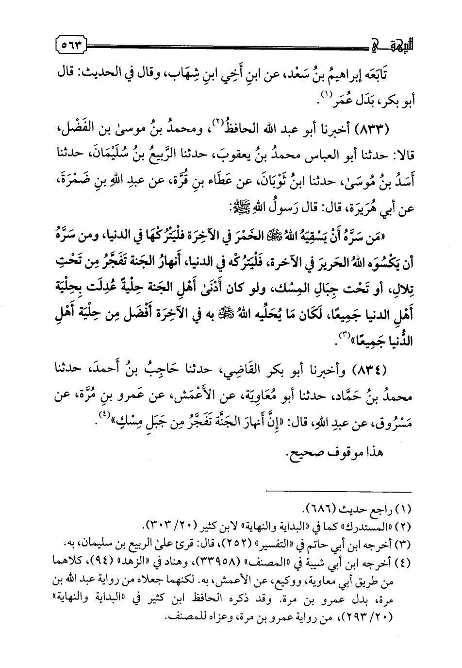 834 - وَأَخْبَرَنَا أَبُو بَكْرٍ الْقَاضِي، حدثنا حَاجِبُ بْنُ أَحْمَدَ، حدثنا مُحَمَّدُ بْنُ حَمَّادٍ، حدثنا أَبُو مُعَاوِيَةَ، عَنِ الْأَعْمَشِ، عَنْ عَمْرِو بْنِ مُرَّةَ، عَنْ مَسْرُوقٍ، عَنْ عَبْدِ اللَّهِ، قَالَ: «إِنَّ أَنْهَارَ الْجَنَّةِ تَفَجَّرُ مِنْ جَبَلِ مِسْكٍ»