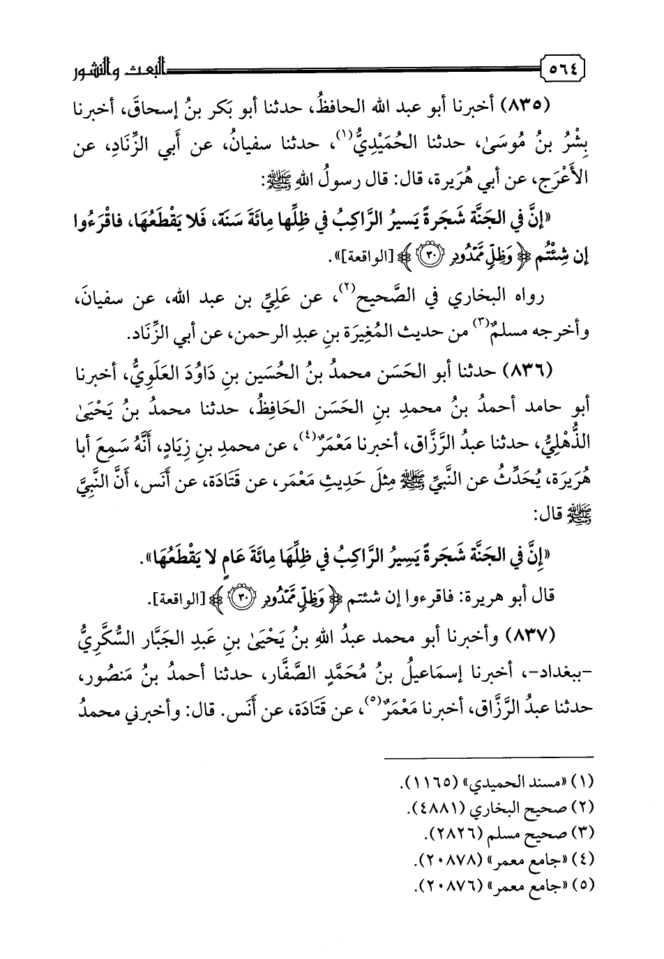 835 - أَخْبَرَنَا أَبُو عَبْدِ اللَّهِ الْحَافِظُ، حدثنا أَبُو بَكْرِ بْنُ إِسْحَاقَ، أَخبرنا بِشْرُ بْنُ مُوسَى، حدثنا الْحُمَيْدِيُّ، حدثنا سُفْيَانُ، عَنْ أَبِي الزِّنَادِ، عَنِ الْأَعْرَجِ، عَنْ أَبِي هُرَيْرَةَ، قَالَ: قَالَ رَسُولُ اللَّهِ صَلَّى اللهُ عَلَيْهِ وَسَلَّمَ: " إِنَّ فِي الْجَنَّةِ شَجَرَةً يَسِيرُ الرَّاكِبُ فِي ظِلِّهَا مِائَةَ سَنَةٍ، فَلَا يَقْطَعُهَا فَاقْرَأوا إِنْ شِئْتُمْ {وَظِلٍّ مَمْدُودٍ} "