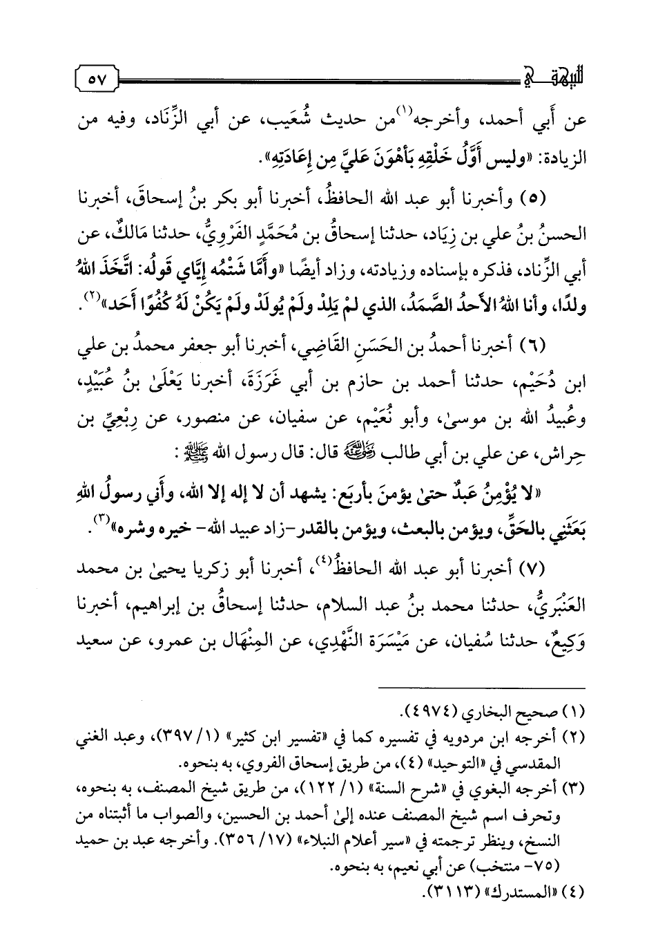 6 - أخبرنا أحمد بن الحسن القاضي، أخبرنا أبو جعفر محمد بن علي بن دحيم، حدثنا أحمد بن حازم بن أبي غرزة، أخبرنا يعلى بن عبيد، وعبيد الله بن موسى، وأبو نعيم، عن سفيان، عن منصور، عن ربعي بن حراش، عن علي بن أبي طالب رضي الله عنه قال: قال رسول الله صلى الله عليه وسلم: "لا يؤمن عبد حتى يؤمن بأربع: يشهد أن لا إله إلا الله، وأني رسول الله بعثني بالحق، ويؤمن بالبعث، ويؤمن بالقدر -زاد عبيد الله- خيره وشره".