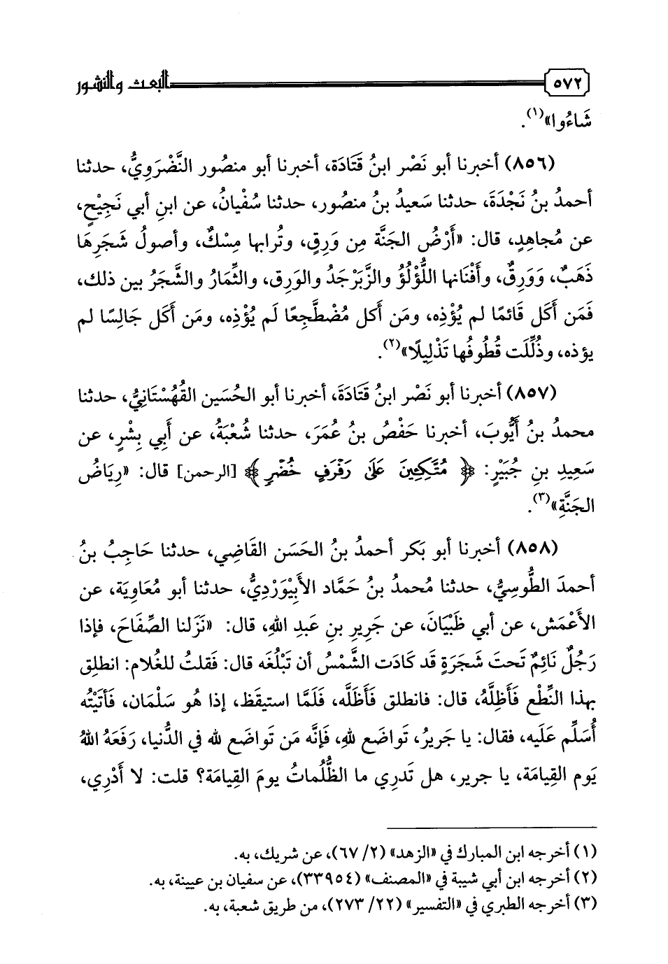 856 - أَخْبَرَنَا أَبُو نَصْرِ بْنُ قَتَادَةَ، أخبرنا أَبُو مَنْصُورٍ النَّضْرَوِيُّ، حَدَّثَنَا أَحْمَدُ بْنُ نَجْدَةَ، حدثنا سَعِيدُ بْنُ مَنْصُورٍ، حدثنا سُفْيَانُ، عَنِ ابْنِ أَبِي نَجِيحٍ، عَنْ مُجَاهِدٍ، قَالَ: «أَرْضُ الْجَنَّةِ مِنْ وَرِقٍ، وَتُرَابُهَا مِسْكٌ، وَأُصُولُ شَجَرِهَا ذَهَبٌ، وَوَرِقٌ، وَأَفْنَانُهَا اللُّؤْلُؤُ وَالزَّبَرْجَدُ وَالْوَرِقُ، وَالثِّمَارُ وَالشَّجَرُ بَيْنَ ذَلِكَ فَمَنْ أَكَلَ قَائِمًالَمْ يُؤْذِهِ، وَمَنْ أَكَلَ مُضْطَجِعًا لَمْ يُؤْذِهِ، وَمَنْ أَكَلَ جَالِسًا لَمْ يُؤْذِهِ، وَذُلِّلَتْ قُطُوفُهَا تَذْلِيلًا».