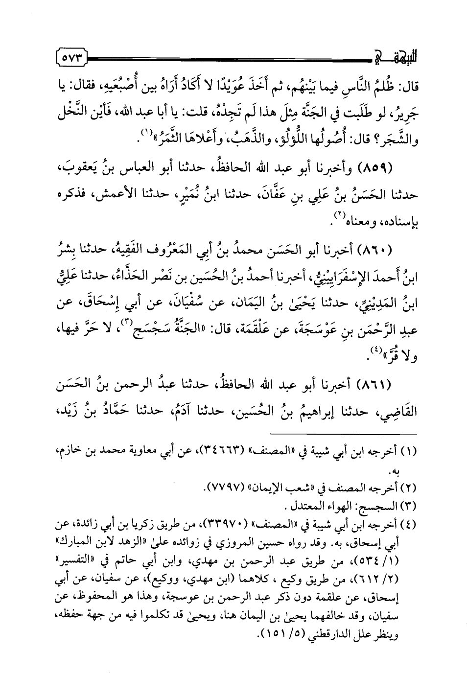 860 - أَخْبَرَنَا أَبُو الْحَسَنِ مُحَمَّدُ بْنُ أَبِي الْمَعْرُوفِ الْفَقِيهُ، حدثنا بِشْرُ بْنُ أَحْمَدَ الإسفراييني، أخبرنا أَحْمَدُ بْنُ الْحُسَيْنِ بْنِ نَصْرٍ الْحَذَّاءُ، حدثنا عَلِيُّ بْنُ الْمَدِينِيِّ، حدثنا يَحْيَى بْنُ الْيَمَانِ، عَنْ سُفْيَانَ، عَنْ أَبِي إِسْحَاقَ، عَنْ عَبْدِ الرَّحْمَنِ بْنِ عَوْشجَةَ، عَنْ عَلْقَمَةَ، قَالَ: الْجَنَّةُ سَجْسَجُ لَا حَرَّ فِيهَا وَلَا قَرَّ ".