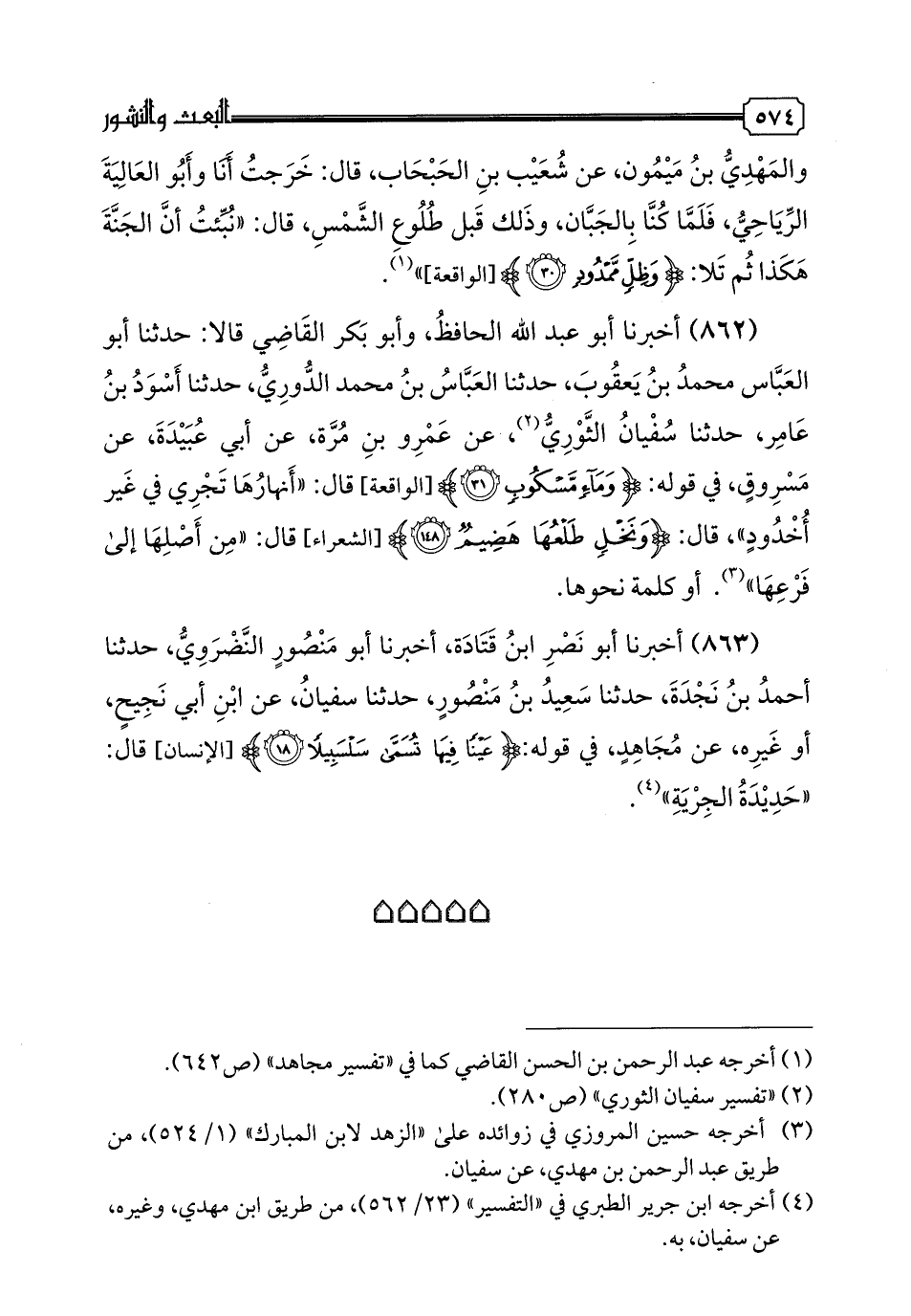 862 - أَخْبَرَنَا أَبُو عَبْدِ اللَّهِ الْحَافِظُ، وَأَبُو بَكْرٍ الْقَاضِي قَالَا: حدثنا أَبُو الْعَبَّاسِ مُحَمَّدُ بْنُ يَعْقُوبَ، حدثنا الْعَبَّاسُ بْنُ مُحَمَّدِ الدُّورِيُّ، حدثنا أَسْوَدُ بْنُ عَامِرٍ، حدثنا سُفْيَانُ الثَّوْرِيُّ، عَنْ عَمْرِو بْنِ مُرَّةَ، عَنْ أَبِي عُبَيْدَةَ، عَنْ مَسْرُوقٍ، فِي قَوْلِهِ: {وَمَاءٍ مَسْكُوبٍ} "، قَالَ: «أَنْهَارُهَا تَجْرِي فِي غَيْرِ أُخْدُودٍ»، قَالَ: {وَنَخْلٍ طَلْعُهَا هَضِيمٌ} "، قَالَ: مِنْ أَصْلَهَا إِلَى فرعها " أَوْ كَلِمَةً نَحْوَهَا.