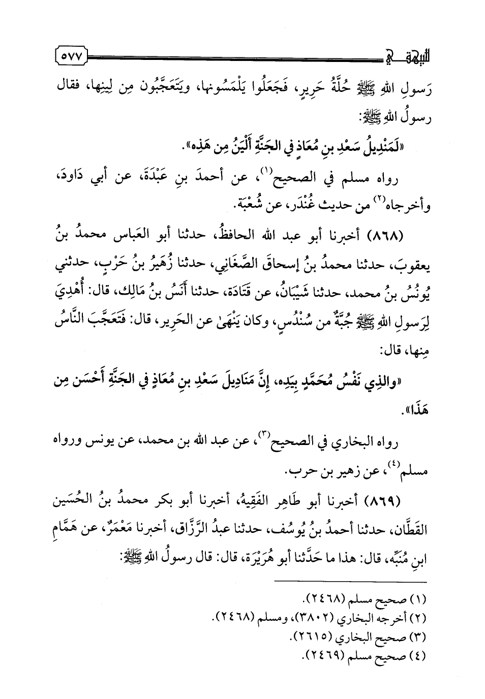 868 - أَخْبَرَنَا أَبُو عَبْدِ اللَّهِ الْحَافِظِ، حدثنا أَبُو الْعَبَّاسِ مُحَمَّدُ بْنُ يَعْقُوبَ حدثنا مُحَمَّدُ بْنُ إِسْحَاقَ الصَّغَانِيُّ، حدثنا زُهَيْرُ بْنُ حَرْبٍ، حَدَّثَنِي يُونُسُ بْنُ مُحَمَّدٍ، حدثنا شَيْبَانُ، عَنْ قَتَادَةَ، حدثنا أَنَسُ بْنُ مَالِكٍ، قَالَ: أُهْدِيَ لِرَسُولِ اللَّهِ صَلَّى اللهُ عَلَيْهِ وَسَلَّمَ جُبَّةٌ مِنْ سُنْدُسٍ، وَكَانَ يَنْهَى عَنِ الْحَرِيرِ، قَالَ: فَتَعَجَّبَ النَّاسُ مِنْهَا، قَالَ: «وَالَّذِي نَفْسُ مُحَمَّدٍ بِيَدِهِ إِنَّ مَنَادِيلَ سَعْدِ بْنِ مُعَاذٍ فِي الْجَنَّةِ أَحْسَنُ مِنْ هَذَا»