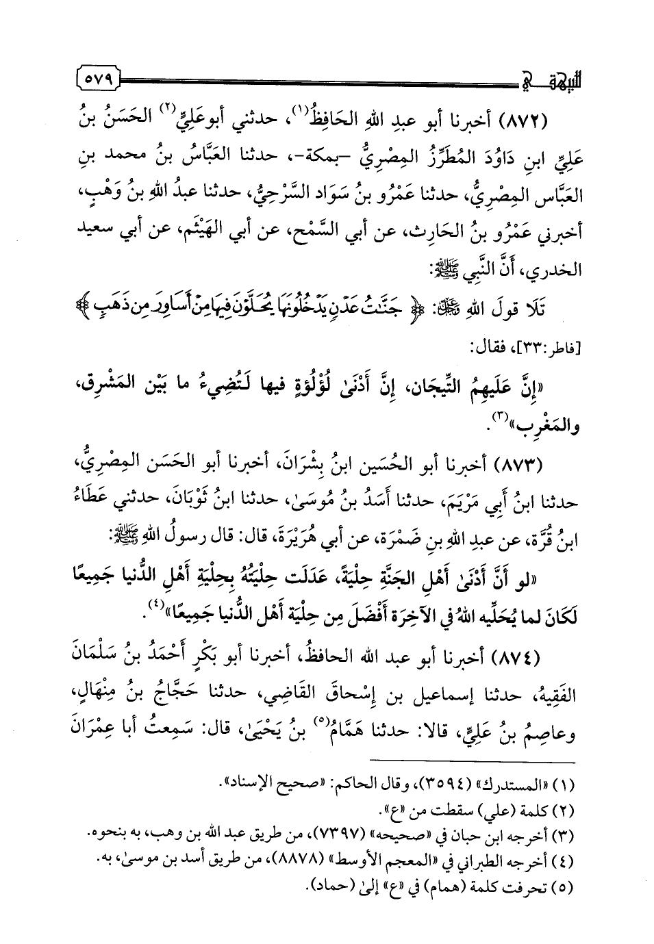 872 - أَخْبَرَنَا أَبُو عَبْدِ اللَّهِ الْحَافِظُ، حَدَّثَنِي أَبُو علي الْحَسَنِ بْنُ عَلِيِّ بْنِ دَاوُدَ الْمُطَرِّزُ الْمِصْريَّ، -بِمَكَّةَ-، حدثنا الْعَبَّاسُ بْنُ مُحَمَّدِ بْنِ الْعَبَّاسِ الْمِصْرِيُّ، حدثنا عَمْرُو بْنُ سَوَّادٍ السَّرْحِيُّ، حدثنا عَبْدُ اللَّهِ بْنُ وَهْبٍ، أَخْبَرَنِي عَمْرُو بْنُ الْحَارِثِ، عَنْ أَبِي السَّمْحِ، عَنْ أَبِي الْهَيْثَمِ، عَنْ أَبِي سَعِيدٍ الْخُدْرِيِّ، " أَنَّ النَّبِيَّ صَلَّى اللهُ عَلَيْهِ وَسَلَّمَ: تَلَا قَوْلَ اللَّهِ عَزَّ وَجَلَّ: {جَنَّاتُ عَدْنٍ يَدْخُلُونَهَا يُحَلَّوْنَ فِيهَا مِنْ أَسَاوِرَ مِنْ ذَهَبٍ}، فَقَالَ: إِنَّ عَلَيْهِمُ التِّيجَانَ، إِنَّ أَدْنَى لُؤْلُؤَةٍ فِيهَا لَتُضِيءُ مَا بَيْنَ الْمَشْرِقِ، وَالْمَغْرِبِ".
