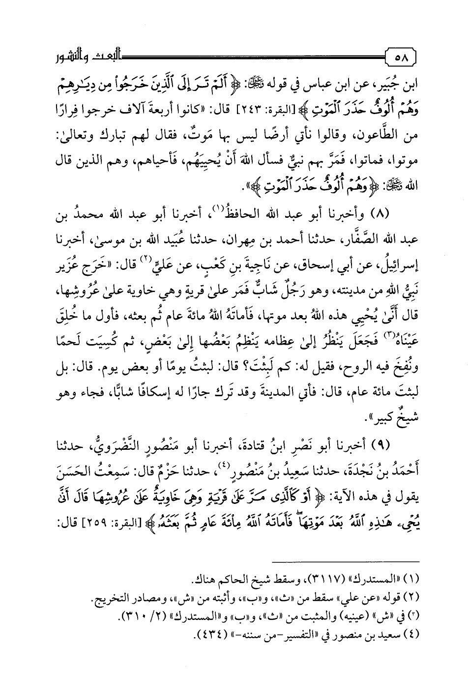 9 - أخبرنا أبو نصر ابن قتادة، أخبرنا أبو منصور النضروي، حدثنا أحمد بن نجدة، حدثنا سعيد بن منصور، حدثنا حزم قال: سمعت الحسن يقول في هذه الآية: {أو كالذي مر على قرية وهي خاوية على عروشها قال أنى يحي هذه الله بعد موتها فأماته الله مائة عام ثم بعثه} قال: "ذكر لنا أنه أميت ضحوة، وبعث حين سقطت الشمس قبل أن تغرب {قال كم لبثت قال لبثت يوما أو بعض يوم قال بل لبثت مائة عام فانظر إلى طعامك وشرابك لم يتسنه وانظر إلى حمارك ولنجعلك ءاية للناس وانظر إلى العظام كيف ننشزها ثم نكسوها لحما} لقد ذكر لي أول شيء ما خلق منه، عيناه فجعل ينظر إلى عظم عظم، كيف يرجع إلى مكانه {فلما تبين له قال أعلم أن الله على كل شيء قدير}.