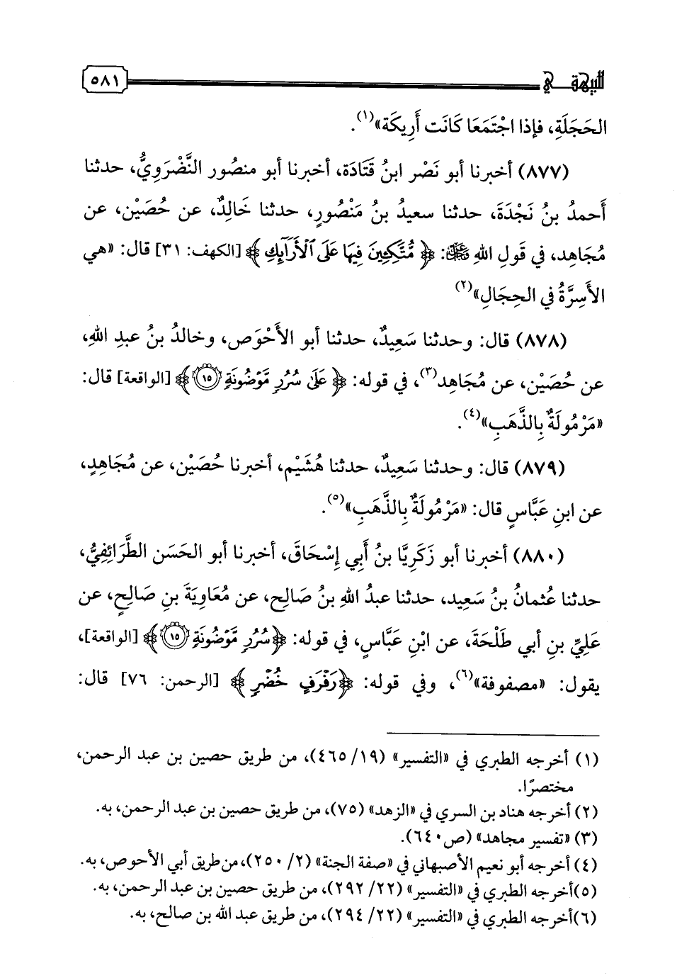 877 - أَخْبَرَنَا أَبُو نَصْرِ بْنُ قَتَادَةَ، أخبرنا أَبُو مَنْصُورٍ النَّضْرَوِيُّ، حدثنا أَحْمَدُ بْنُ نَجْدَةَ، حدثنا سَعِيدُ بْنُ مَنْصُورٍ، حدثنا خَالِدٌ، عَنْ حُصَيْنٍ، عَنْ مُجَاهِدٍ، فِي قَوْلِ اللَّهِ عَزَّ وَجَلَّ: {مُتَّكِئِينَ فِيهَا عَلَى الْأَرَائِكِ} "، قَالَ: «هِيَ الْأَسِرَّةُ فِي الْحِجَالِ»